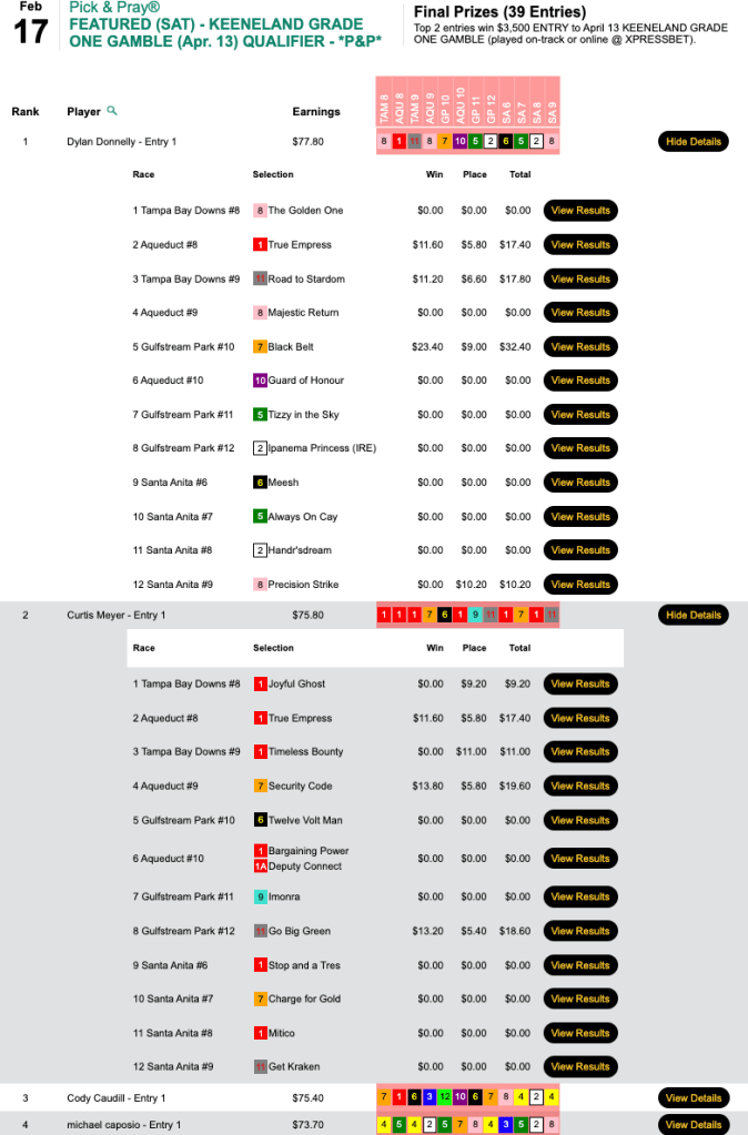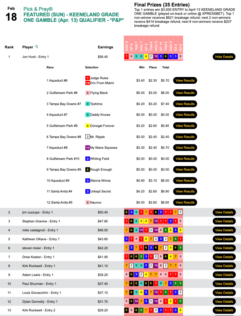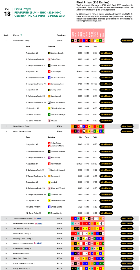 Okasaki accumulated 5 firsts and 1 second to collect $13,190 in Sunday’s HT Tour event, our $20,000 Gtd. Pick & Pray, which paid out a total of $29,312. He had the day’s biggest price horse in Holdtheflight ($19.20, $9.40), the winner of race 7 at Aqueduct.