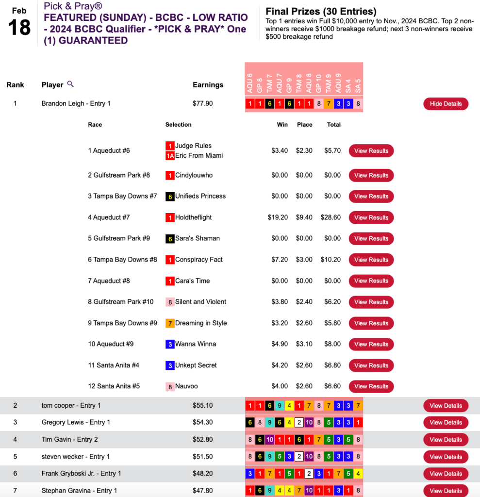 If you haven’t noticed by now, there weren’t a lot of pricy horses out there on Sunday. Loren Rice’s highest-paying winner on Sunday returned $4.90, and yet she won a $6,000 seat!