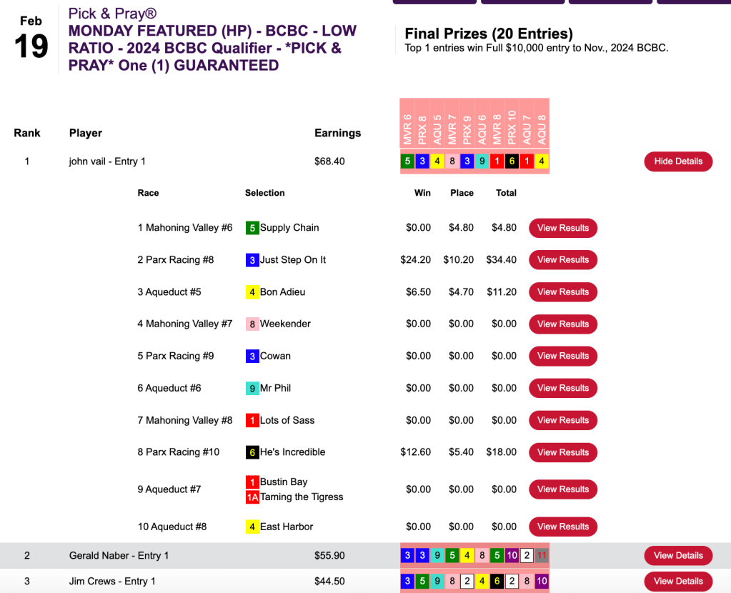 Vail garnered the $10,000 seat in Monday’s 20-entry, Low Ratio qualifier to the Breeders’ Cup Betting Challenge.