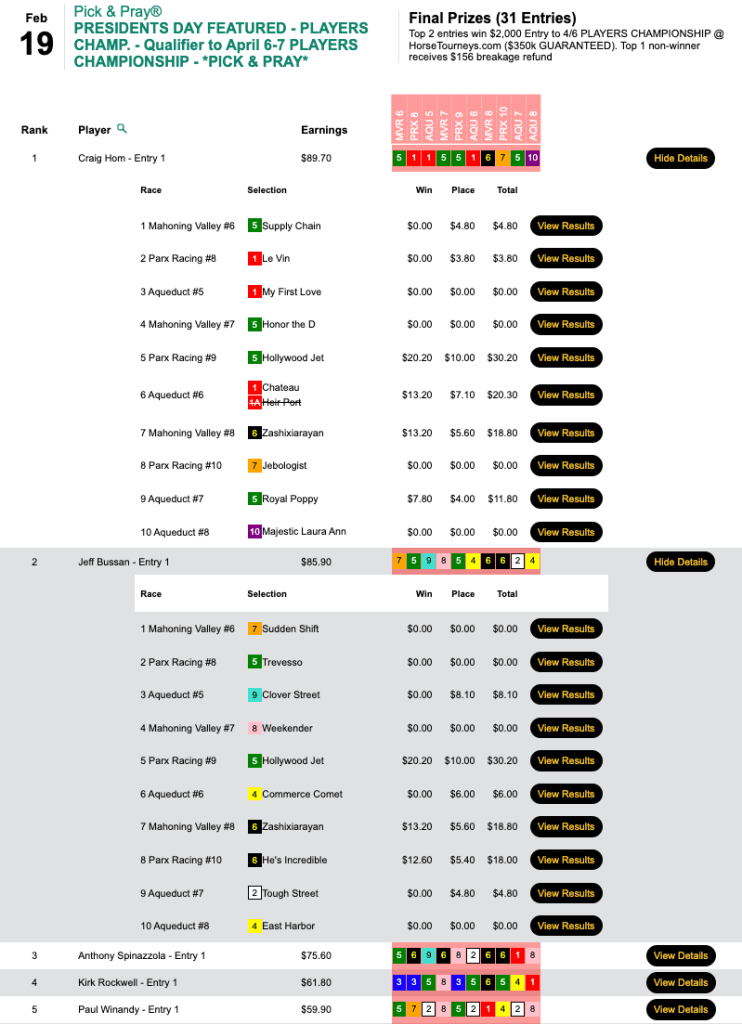 Bussan got Players Championship seat #2 by checking in 2nd behind Craig “Home Sweet” Hom (4 wins, 2 places). Hom and Bussan both felt like stars after selecting Hollywood Jet ($20.20, $10.00) in the 9th at Parx.