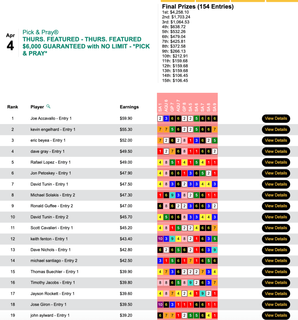 Accavallo did all of his scoring during a 6-race stretch in mid-tourney when he fired off 4 winners and 2 runners up. The six-race salvo gave Accavallo a score of $59.90—good for a winner’s share of $4,258 in Thursday’s $6,000 Gtd. Pick & Pray, which closed with a final purse of $10,645.