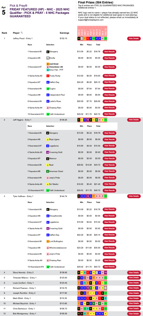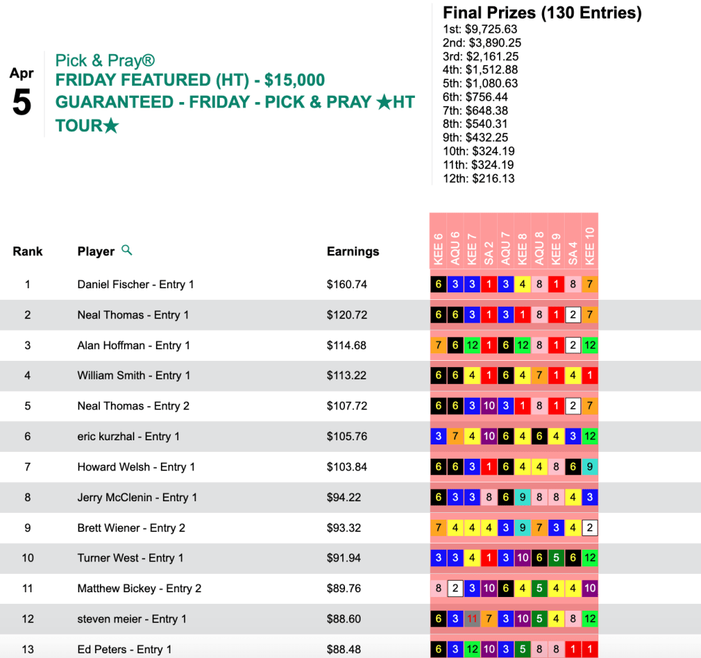 Fischer picked 6 Friday winners—all in the first 7 contest races—to collect $9,725 in Friday’s HT Tour event, our $15,000 Gtd. Pick & Pray, which closed up shop with $21.612 in the kitty. One of Fischer’s winners paid $40.02 and three others paid $22.00+.