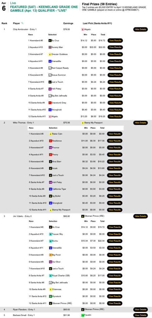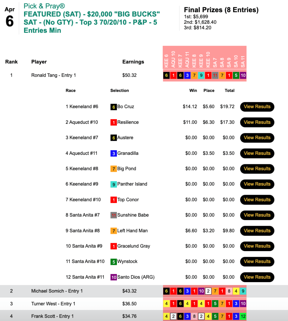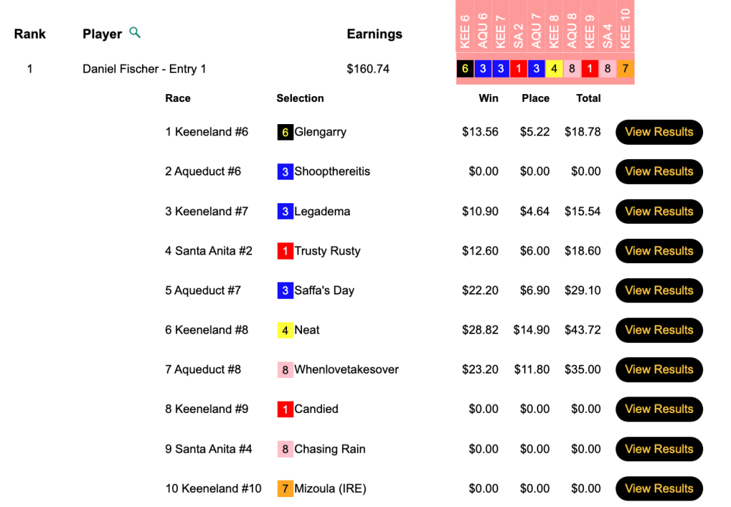 There were enough entries signed on for 6 spots to be awarded. They went to Jeffrey Pesot (5 wins, 2 places), Jeff Higgins (5W, 2P), Tyler Hoffman (5W, 1P), “The Admiral” Steve Nemetz (5W, 0P), Tchavdar Milanov (4W, 0P) and Louie Ucciferri (3W, 2P). The big horse for all but Nemetz was Faith Understood ($29.02, $11.70) in the 10th race at Keeneland.
