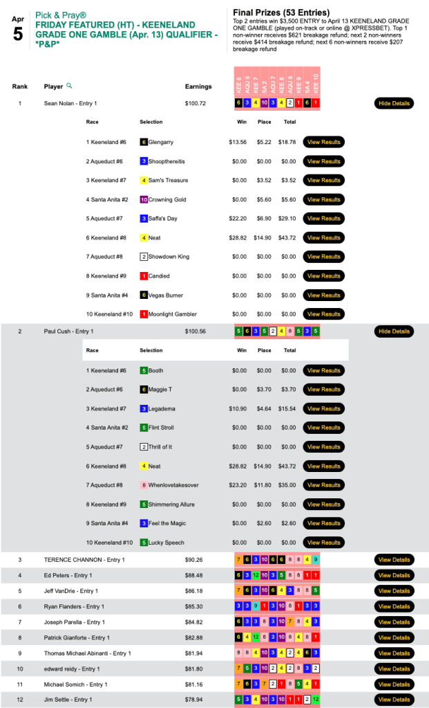 Thanks to 2 wins and 2 places, Nolan finished in between fellow Keeneland seat winners Daven Turner (4W, 0P) and this year’s Flo-Cal Faceoff champ Michael Solakis (3W, 0P). All three had victorious Santa Anita race 3 longshot Grazen in the Sun ($35.20, $15.40).