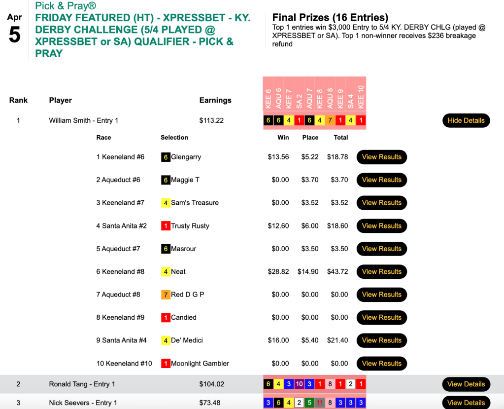 Smith put together 4 firsts and 3 seconds to emerge with the $3,000 entry at the conclusion of Friday’s Kentucky Derby Challenge qualifier.