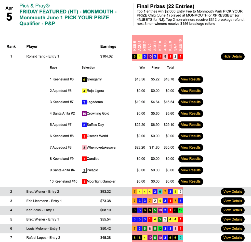 In all, Tang amassed 4 firsts and 1 second, and he got the $2,000 entry in Friday’s qualifier to the Monmouth Pick Your Prize tournament on June 1.