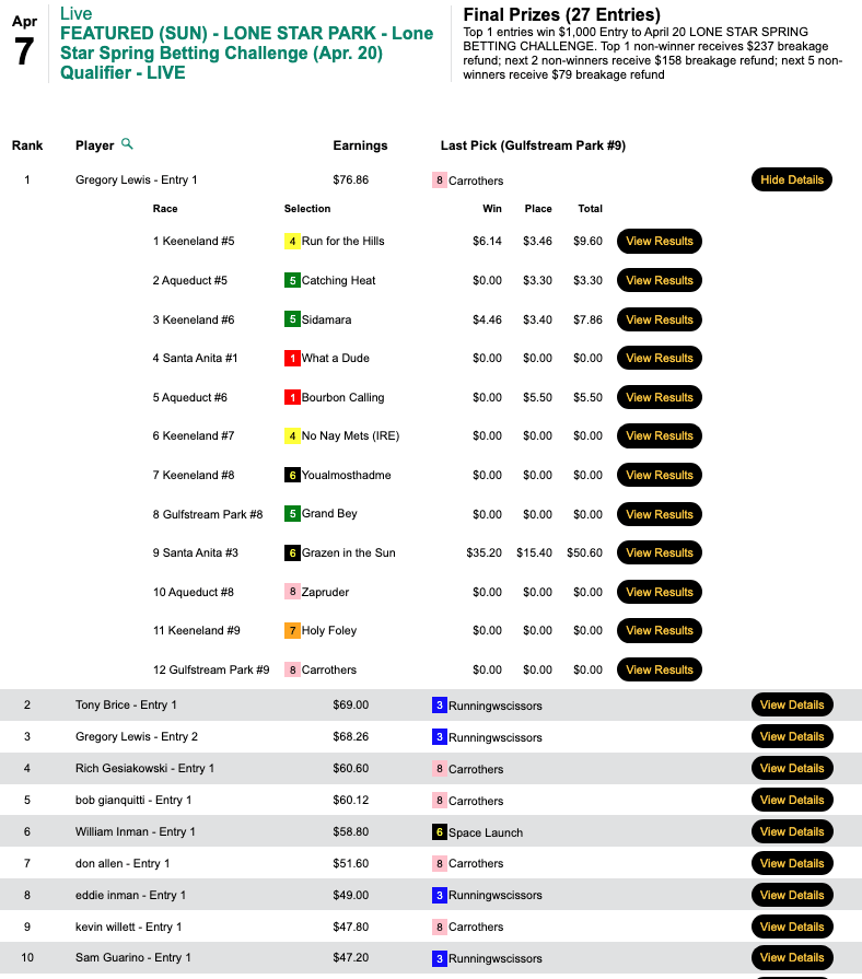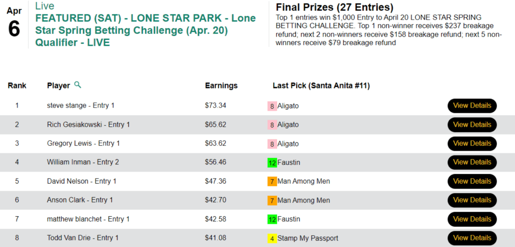 Stange stung his opponents with 5 winners and 1 runner up to earn the $1,000 seat in Saturday’s Lone Star Spring Betting Challenge qualifier.