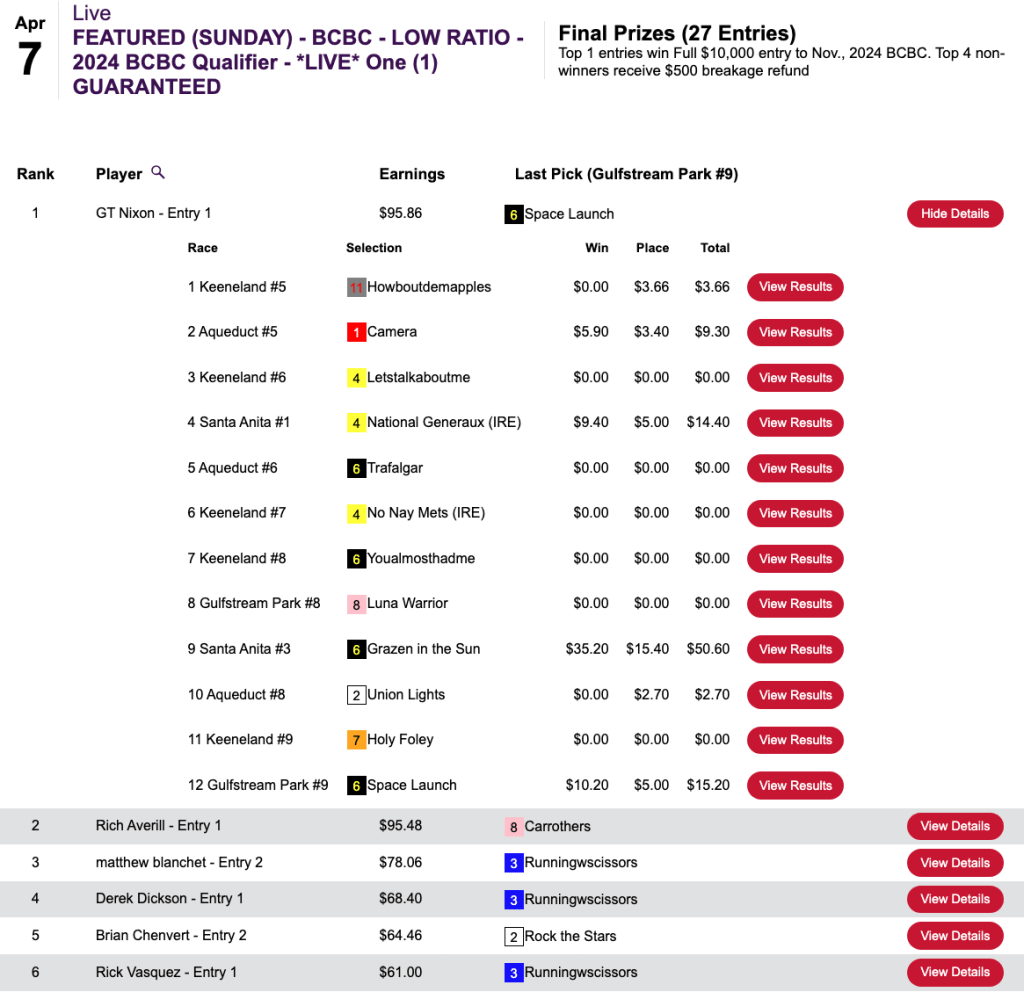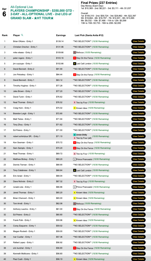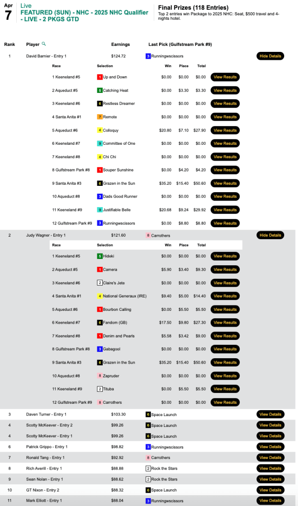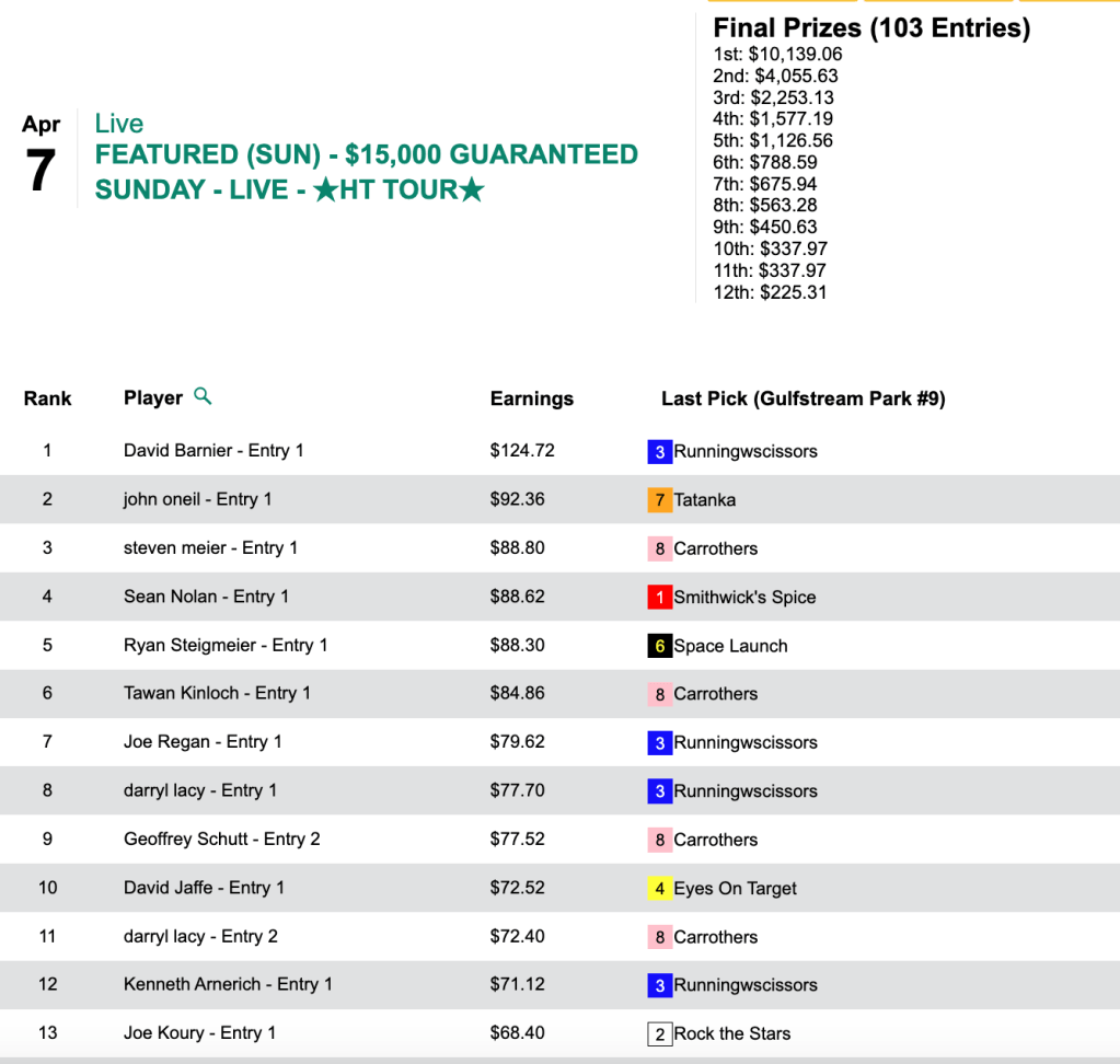 All three of Barnier’s winners returned at least $20.00. To that trio, he added two place collections, and he pocketed $10,139 for taking Sunday’s HT Tour competition, our $15,000 Guaranteed tourney, which was ultimately worth a total of $22,531.