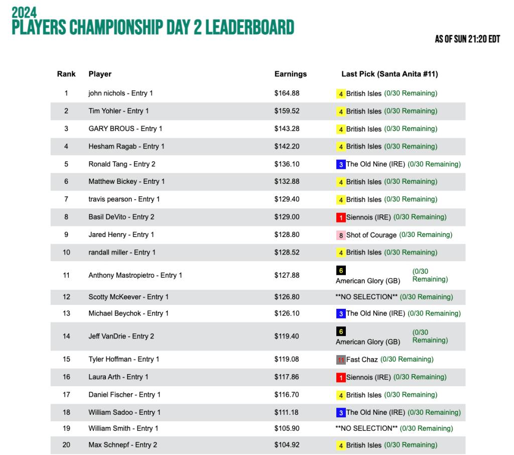 The leaderboard was tight at the top with one race to go in Saturday’s Monmouth Pick Your Prize qualifier.