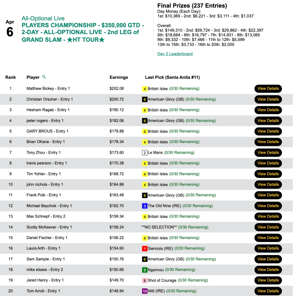 Trailing Christian Orscher by $10.64 with one contest race remaining in the $415,418 Players Championship, Matthew Bickey boldly selected 21-1 shot British Isles. When the Richard Baltas charge got up for second in that 11th race at Santa Anita behind winning 6-5 favorite Ngannou, the result was a $12.00 place payoff for British Isles backers—and a triumph worth $149,310 for Bickey.