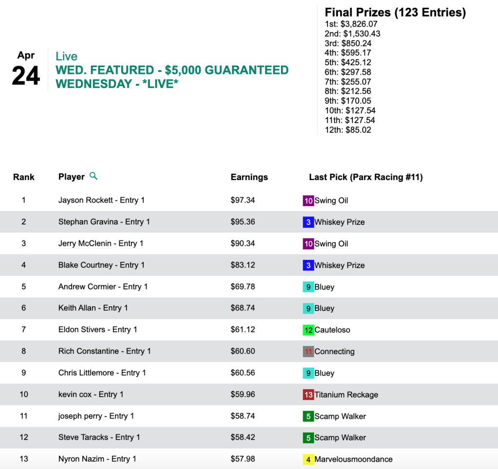 Decanted was one of 4 winners—that paired nicely with a place collection—and earned Rockett $3,826 in Wednesday’s $5,000 Guaranteed cash tourney, which ultimately was worth $8,502.