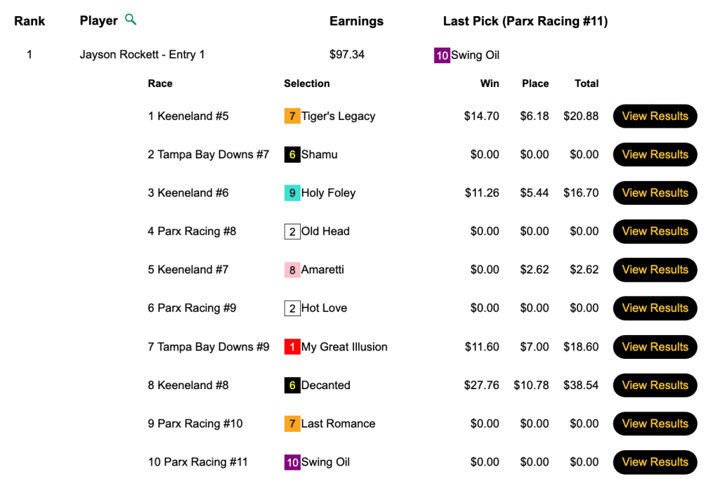 Congratulations to Ken Jordan (4 wins, 1 place) and Steven Meier (5W, 1P). They both got off to fast starts with Tiger’s Legacy ($14,70, $6.18) in the first contest race, the 6th at Keeneland.