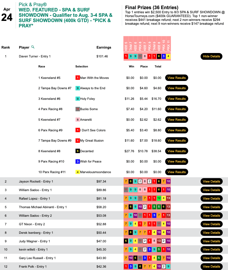 The featured-tourney week got rolling on Wednesday when Daven Turner used Decanted ($27.76, $10.78) in the 8th at Keeneland as a springboard to success in the day’s Spa & Surf Showdown qualifier.
