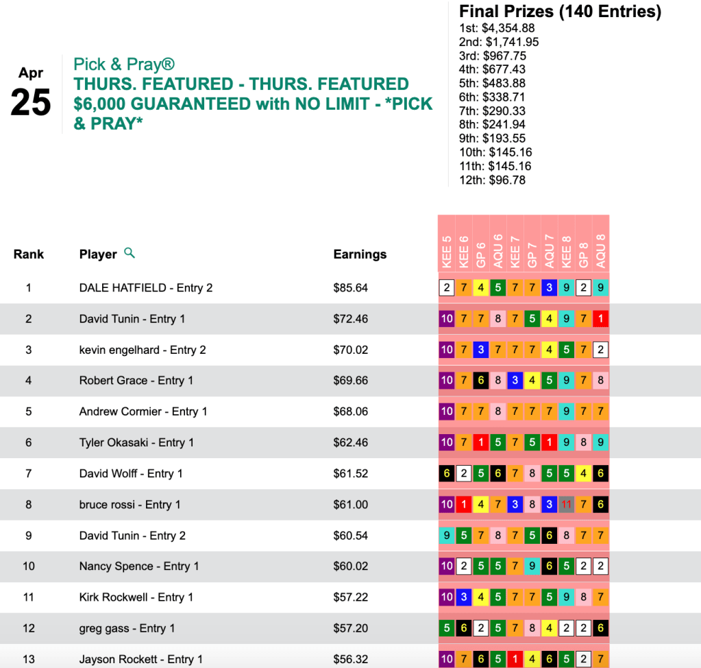 Dale Hatfield had Beaumont Red plus 4 other winners and 2 runners up. The 7 collections paid Hatfield to the tune of $4,354 in Thursday’s $6,000 Gtd. Pick & Pray, which closed with a pot of $9,677.