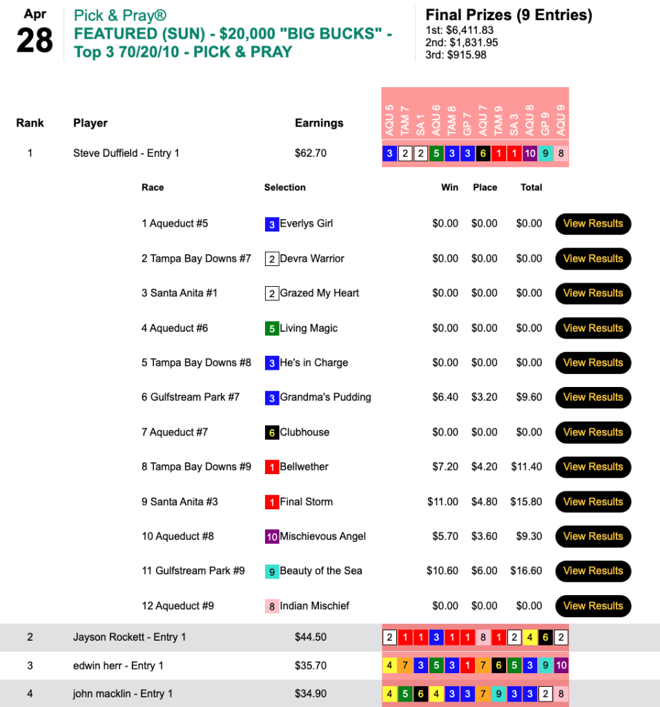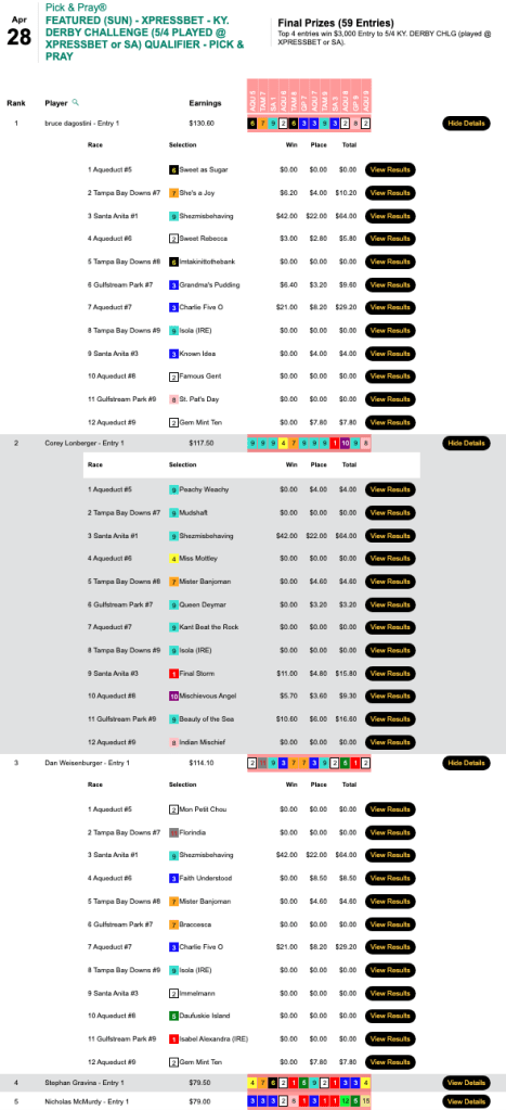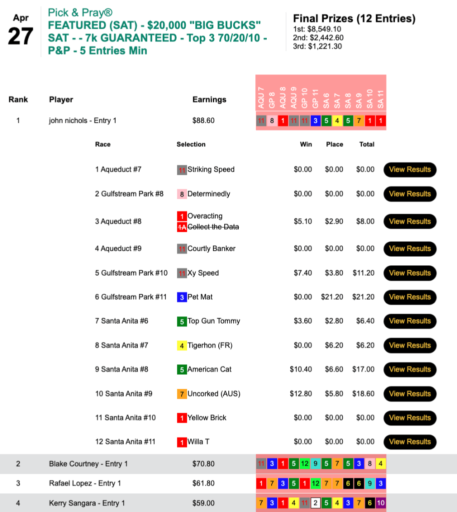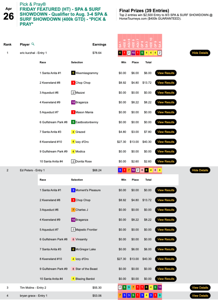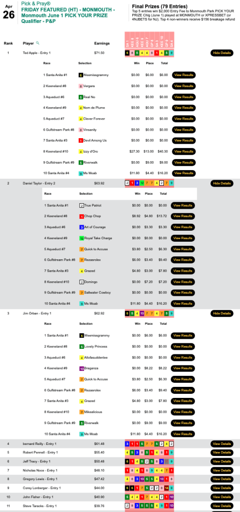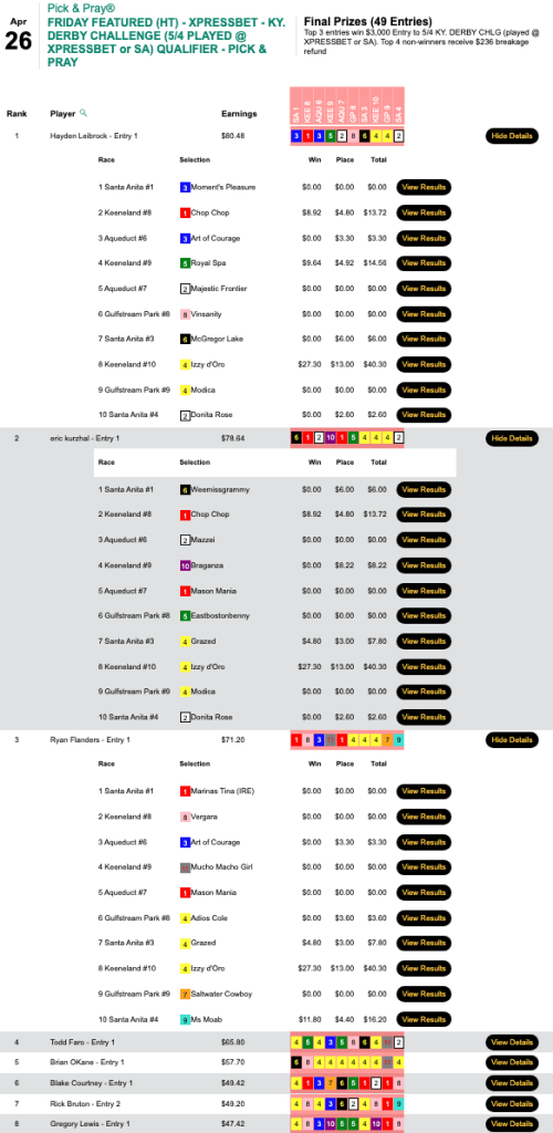 Leibrock counted Izzy d’Oro ($27.30, $13.00) in the 10th at Keeneland as his heaviest lifter among 3 firsts and 3 seconds. Leibrock pocketed $9,650 for taking the Friday HT Tour event, our $15,000 Gtd. Pick & Pray, which had a final prize pool of $21,446.