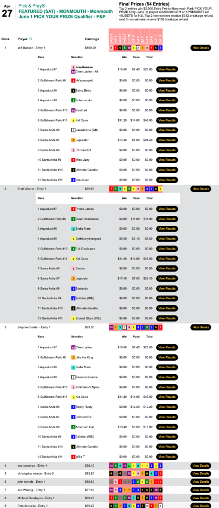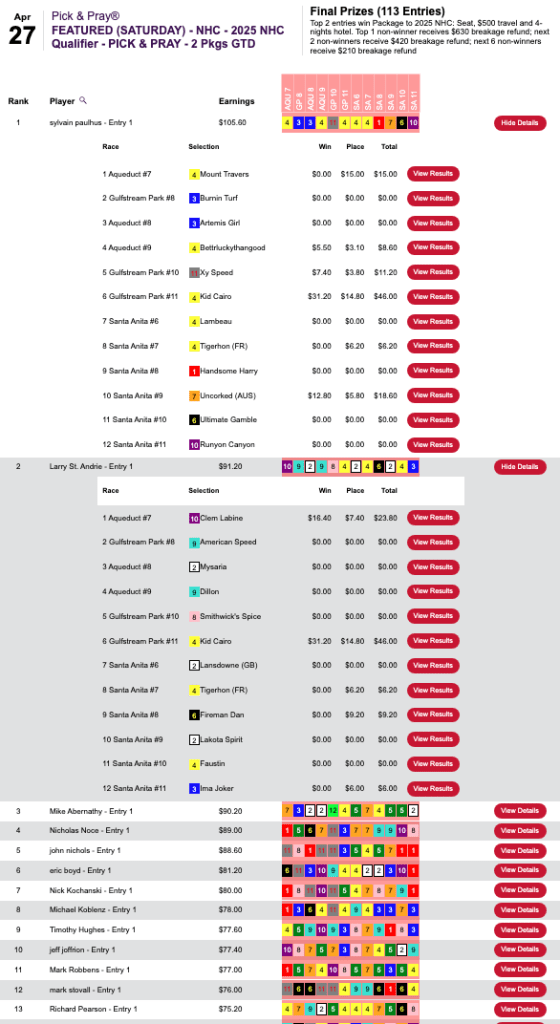 The redoubtable Kevin Engelhard (4 wins, 1 place) led the way and picked up his second 2025 NHC spot in this one. Just 22 cents behind Engelhard was Leonard Peterson (4W, 2P), who will be on his way to Vegas in 10 1/2 months along with Kurzhal. Izzy d’Oro was common to the three winners’ scorecards.