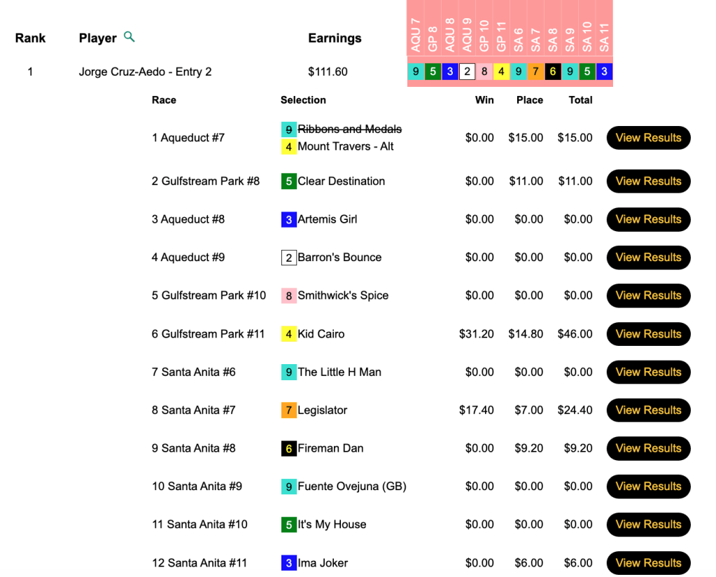 No need for any controversy. Wiener is already double qualified to the 2025 event. And Sylvain Paulhus (4 wins, 2 places) and Larry St. Andrie (2W, 3P) are each now single qualified to it. They had their opponents saying “Sacre bleu!” when they scored with Kid Cairo. Or maybe it was “Quel dommage.” In any event, they got the Vegas seats. It was a bit touch-and-go for St. Andrie, though. He caught a relatively modest $6.00 place collection in the final contest race, and that elevated him all the way from 6th to 2nd at the end.