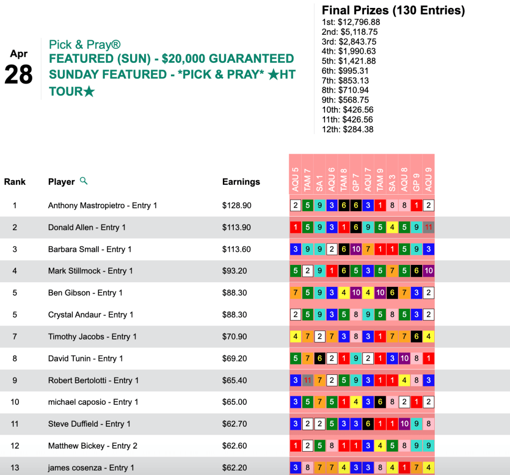 Mastropietro had Shezmisbehaving plus 2 other winners and 2 places to reel in $12,796 in a $20,000 Guaranteed cash tourney that paid out a total of $28,437.