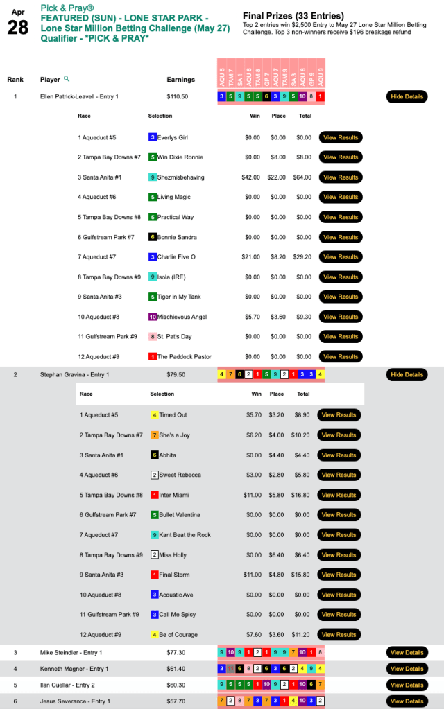 Gravina again had just enough to snatch something good from the prize pool of our first qualifier to the Lone Star Million Betting Challenge on May 27. Two $2,500 entries were at stake in this one, and the other went to the victorious Ellen Patrick-Leavell (3 wins, 1 place), whose selection of Shezmisbehaving helped her level her rivals.