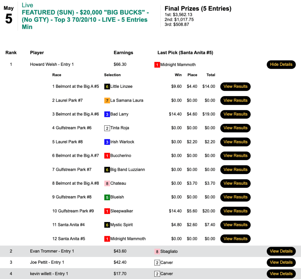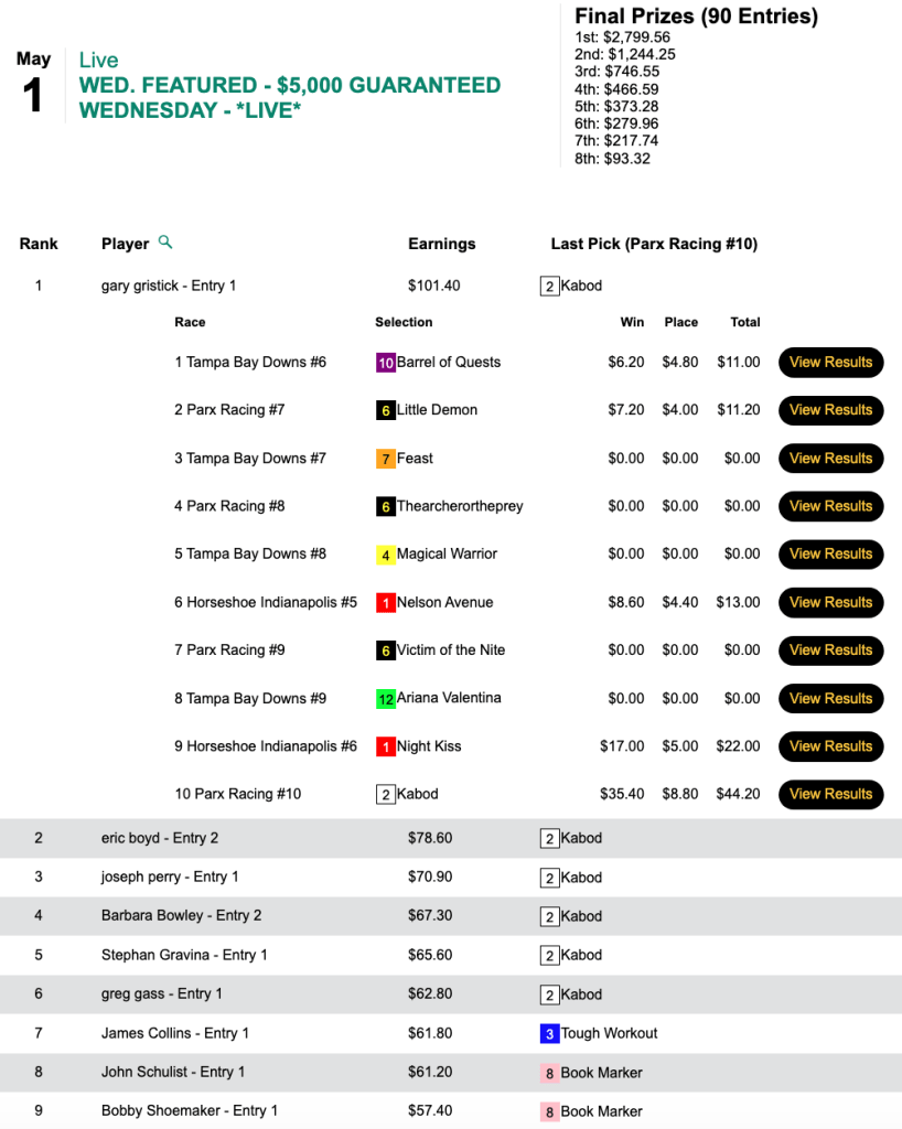 Michael Foster had Freedom Principle, plus two other winners, plus a runner up that paid the $22.00 contest maximum to place.