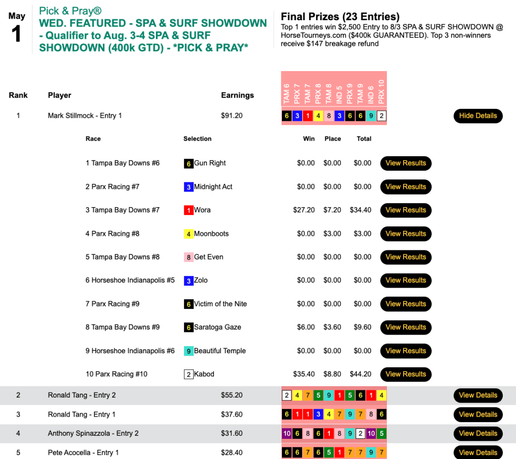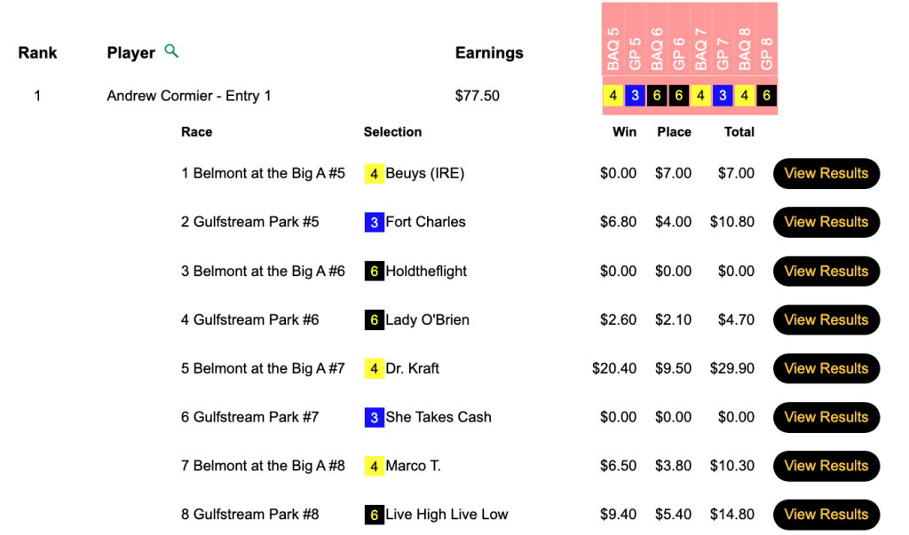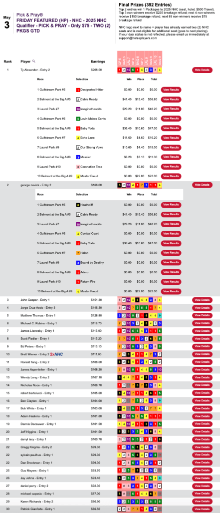 As it so often does, the Friday high score was on display over at HorsePlayers where Ty Alexander put up a tally of $208.50.