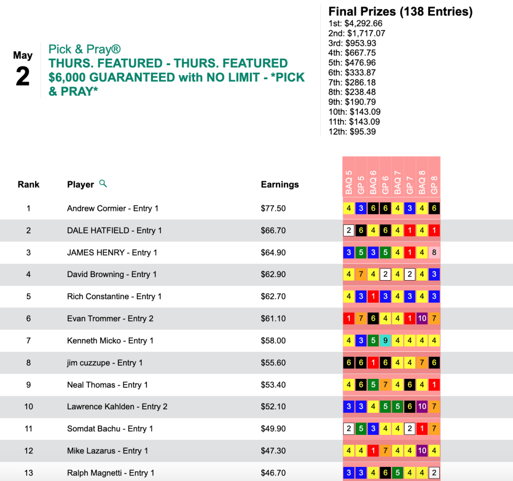 Andrew Cormier (5 firsts, 1 second) had the good doctor, and Cormier pocketed $4,292 in Thursday’s $6,000 Gtd. Pick & Pray, which closed with a pot of $9,539.