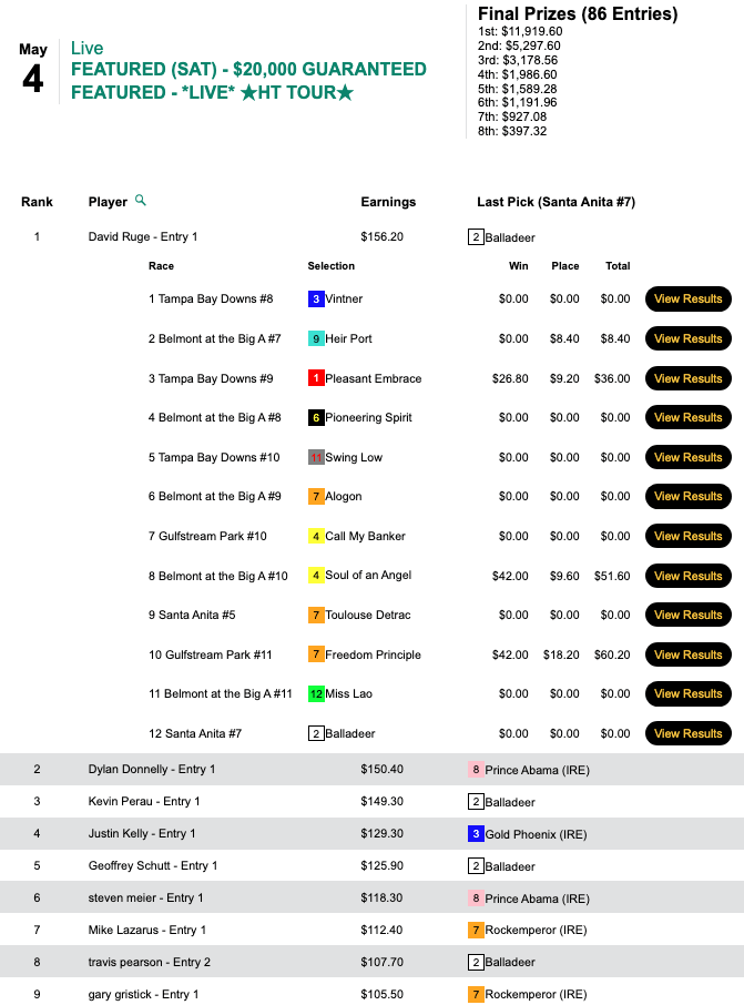 David “Bleu, blanc et” Ruge (3 firsts, 1 seconds) reeled in the top prize of $11,919. On a day in which 6 of the day’s 12 contest-race winners paid $20.00 or more, Ruge nailed 3 fo those 6—Pleasant Embrace ($26.80, $9.20) in the 9th at Tampa, Soul of an Angel ($51.00, $9.60) in the 10th at BAQ and Freedom Principle ($44.60, $18.20) in race 11 at Gulfstream.
