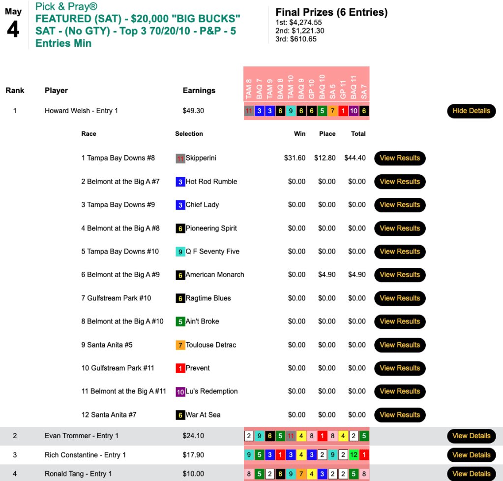 On Saturday, Welsh’s scoring in the first contest race with Skipperini ($31.60, $12.80) turned out to be all he needed. (Welsh drove that point home by hitting very little the rest of the way!) Welsh took home the Derby Day winner’s share of $4,274 from a final prize pool of $6,106.