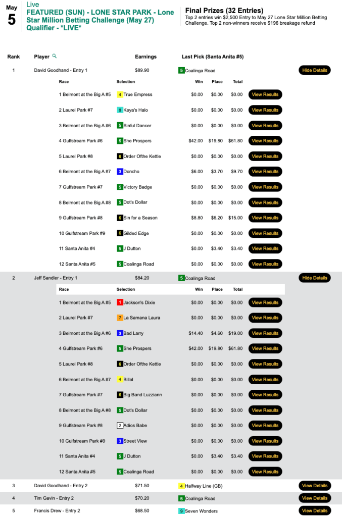They will be there—with paid-up $2,500 entries—thanks to their performance in Sunday’s qualifier to it. Goodhand (3 wins, 1 place) and Sandler (2W, 1P) both prospered from the victory by She Prospers.