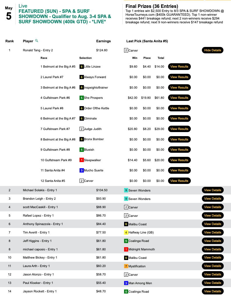 The same picks yielded the same result for Holmes in this Live-format game. The second and final available seat went to Joel Hanson. Like Holmes, Hanson enjoyed a big early hit with She Prospers. However, Hanson needed Man Among Men ($6.60, $3.80) in the final contest race (the 5th at Santa Anita) to get up for second place.