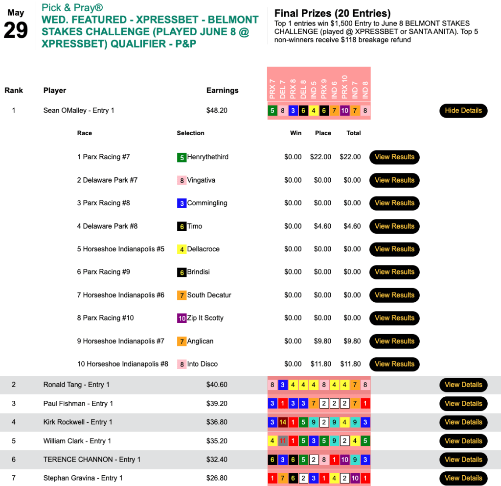 As mentioned last week, pretty is as pretty does. O’Malley caught a max $22.00 place payoff by having 55-1 Henrythethird…who was Henrythesecond in the first contest race, the 7th at Parx. Three place collections later, O’Malley had a score of $48.20—and a $1,500 seat for this coming Saturday’s Belmont Stakes Challenge.