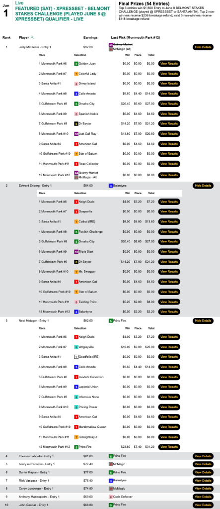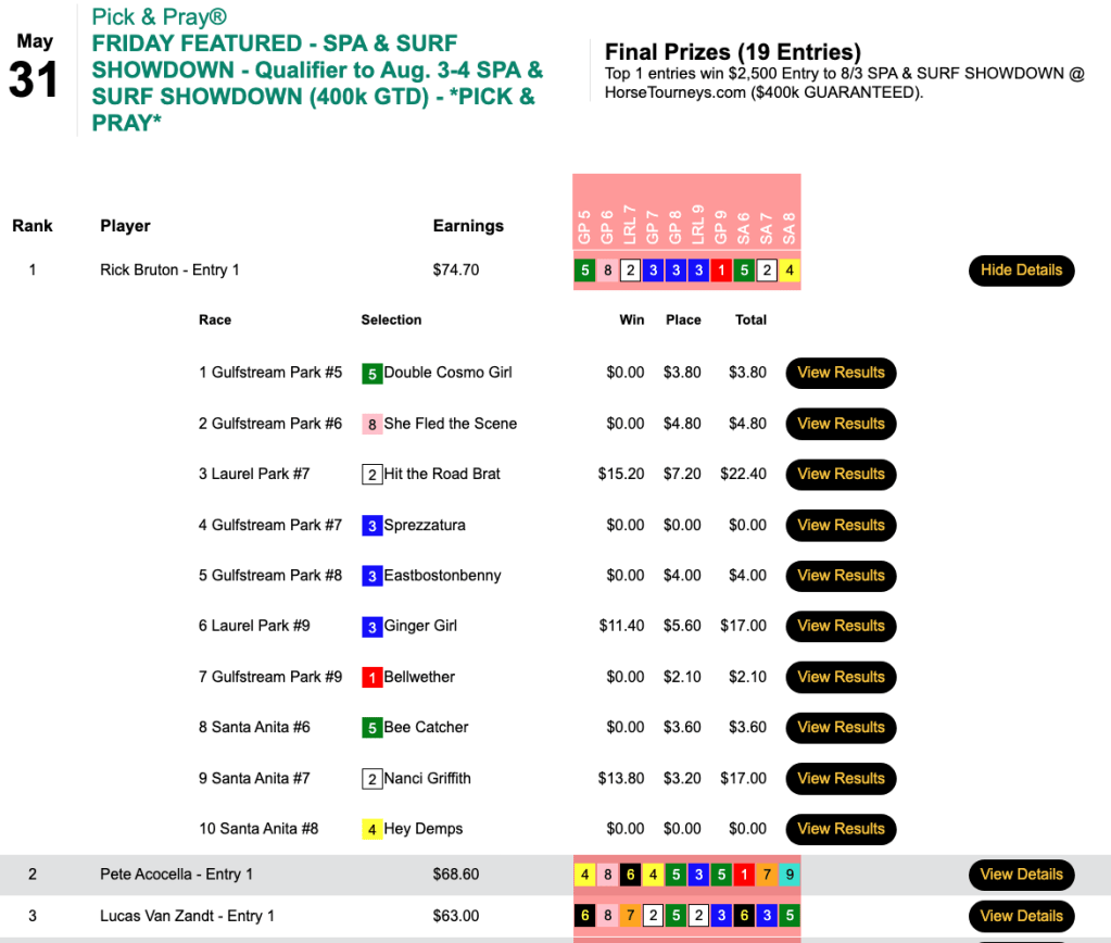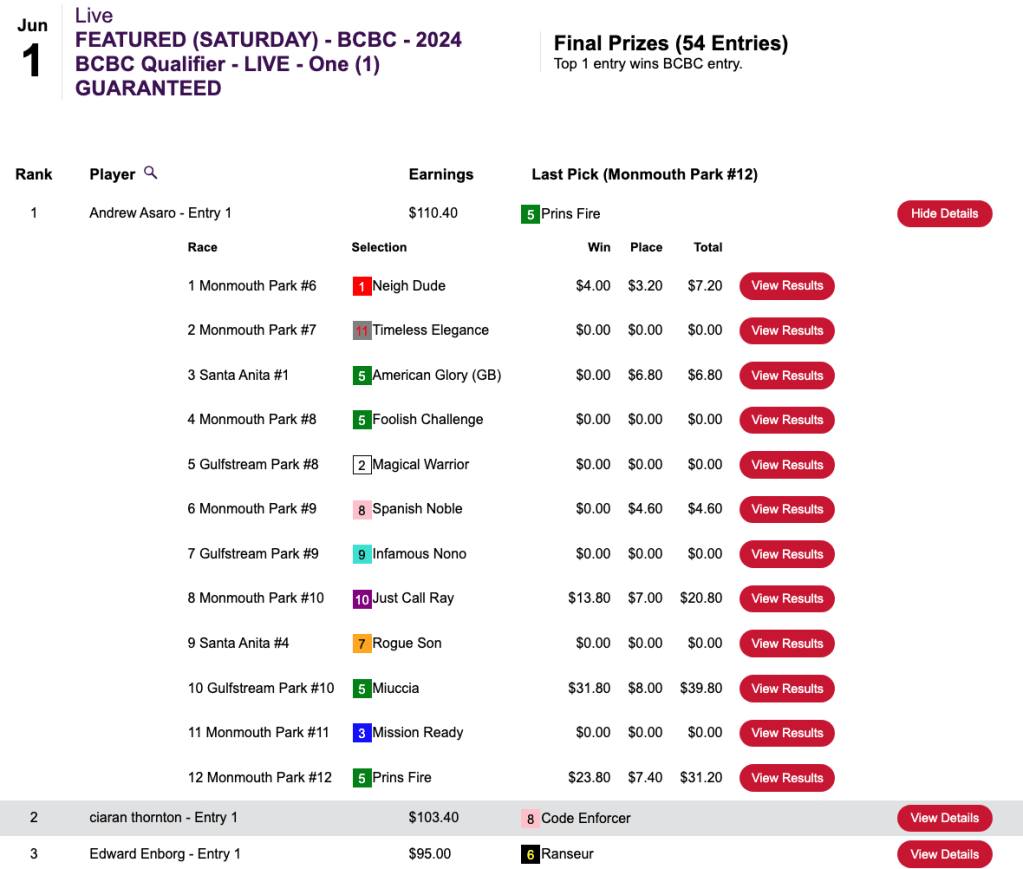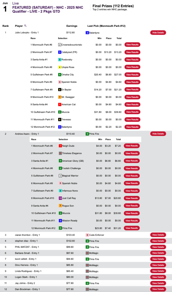 Loboyko missed on Prins Fire at the end, but she connected on 3 winners (including Muccia) and 3 runners up before that to hold off Asaro—who completed his “very good day” by getting the second seat in the $165 NHC qualifier at HorsePlayers.