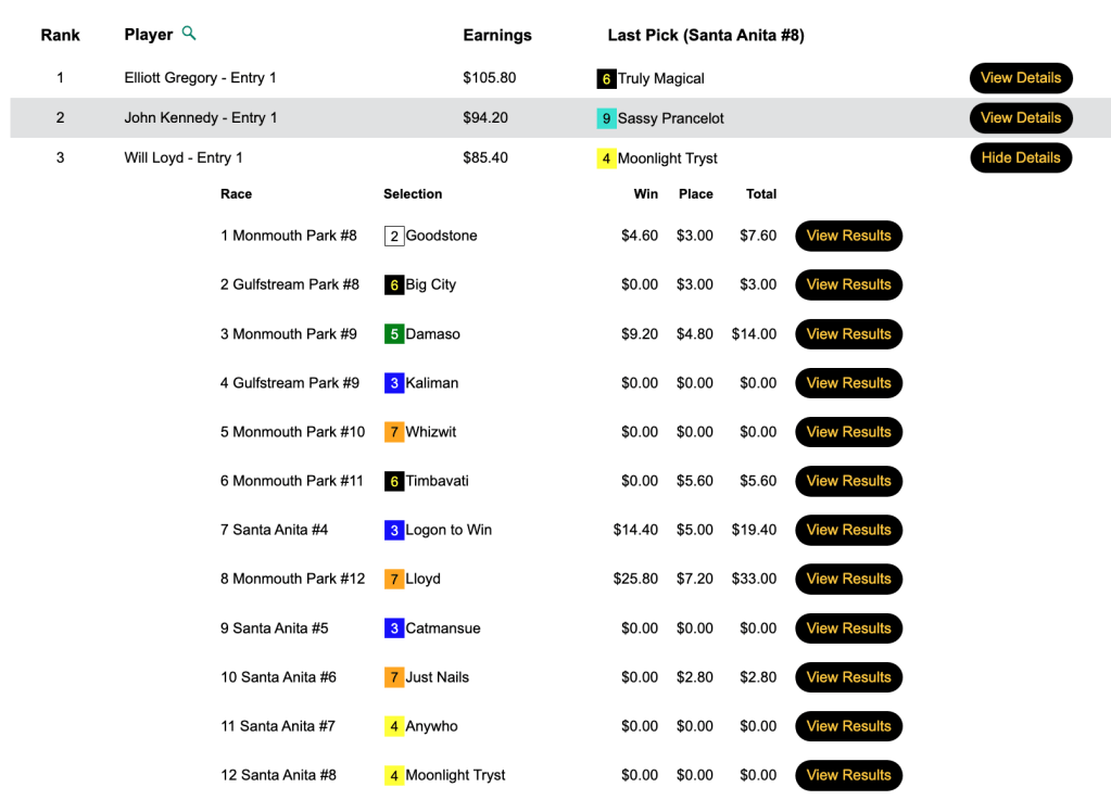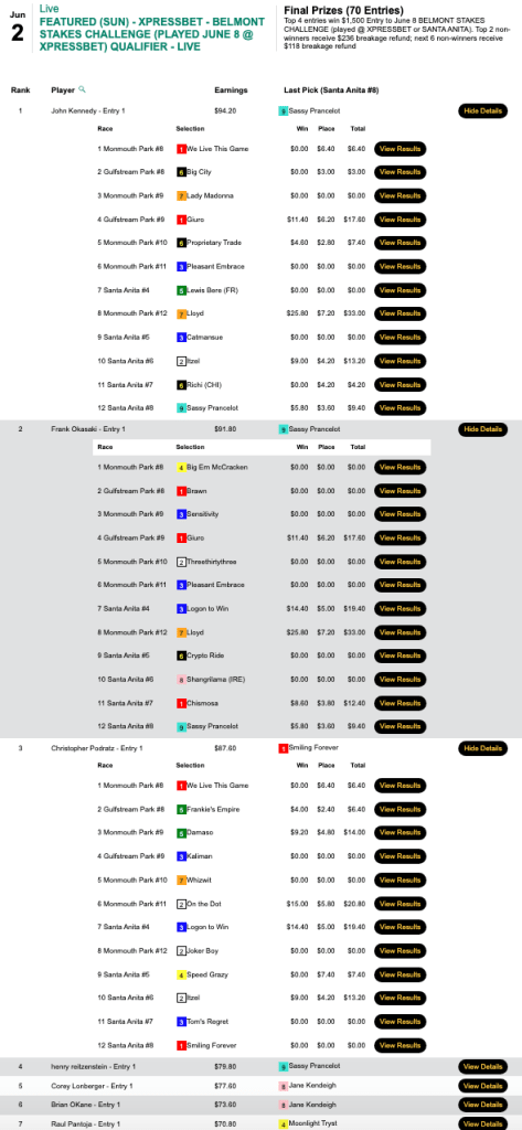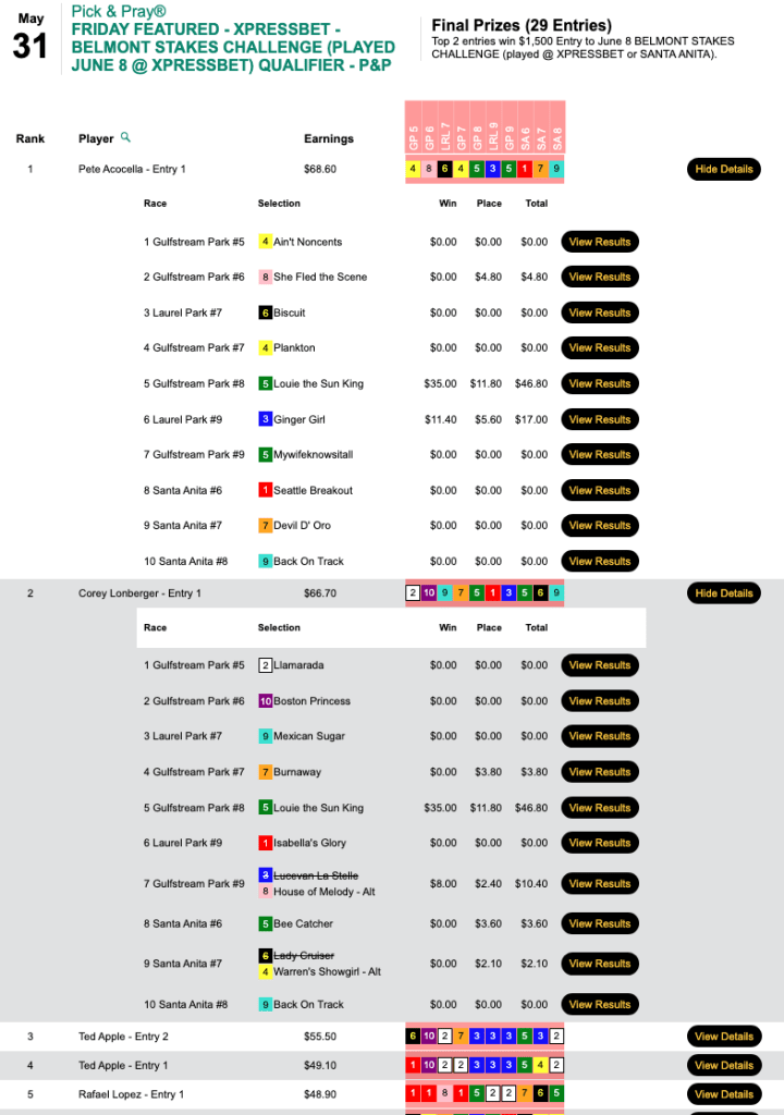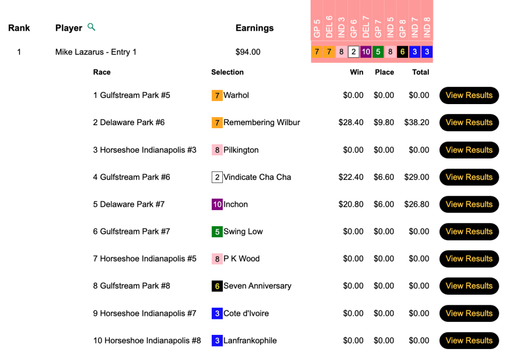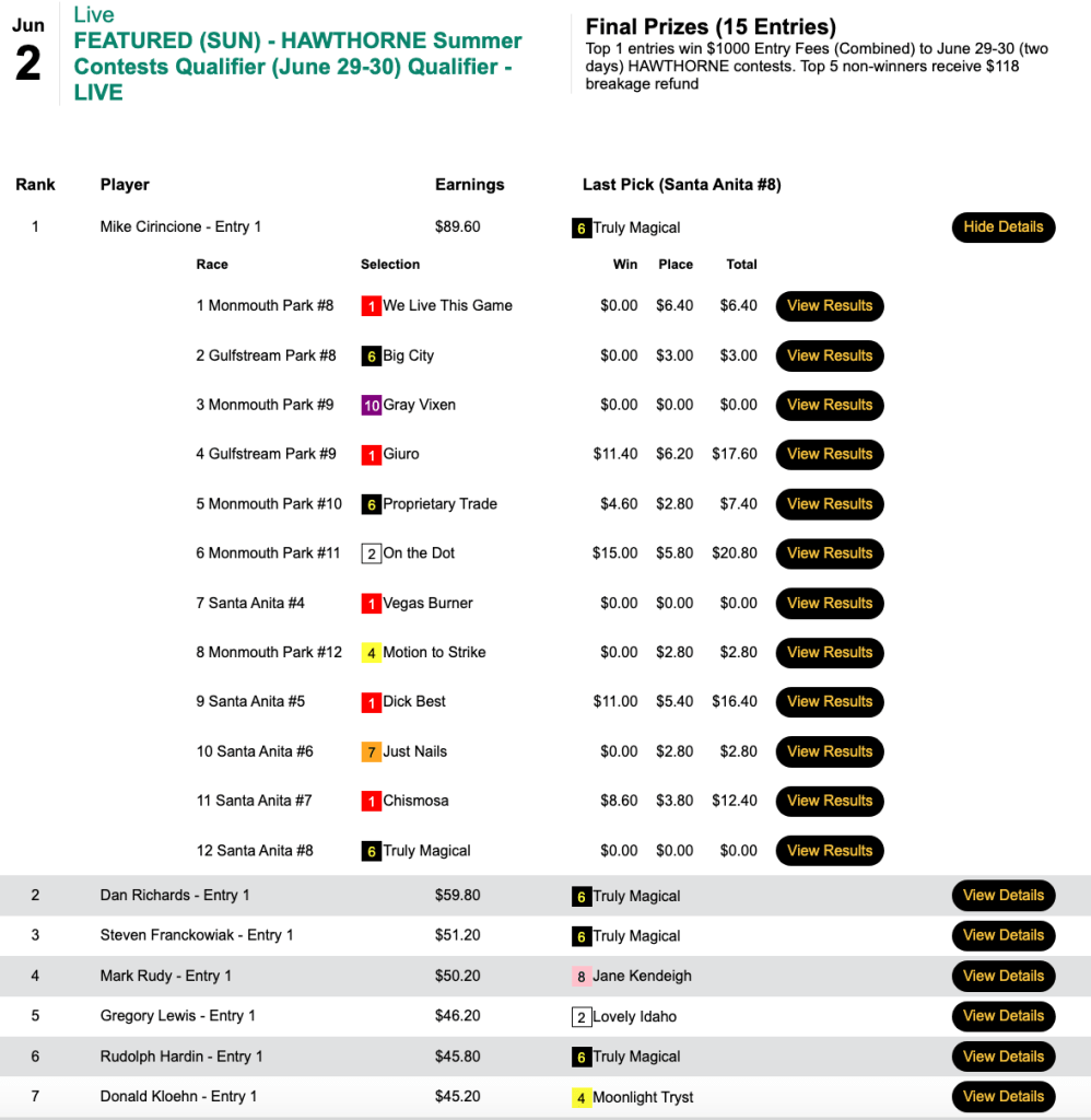 Loboyko missed on Prins Fire at the end, but she connected on 3 winners (including Muccia) and 3 runners up before that to hold off Asaro—who completed his “very good day” by getting the second seat in the $165 NHC qualifier at HorsePlayers.