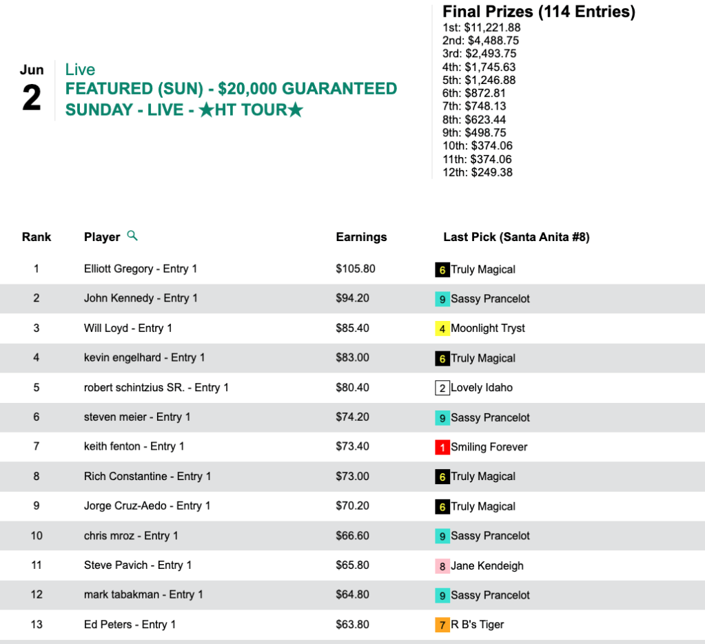 Arnerich had 5 firsts and 1 second in all, and he got the up-top money of $8,304 in Friday’s HT Tour battle, our $15,000 Gtd. Pick & Pray, which closed with a purse of $18,453. Arnerich also received a $500 bonus since this was his 2nd Friday HT Tour victory in 2024.