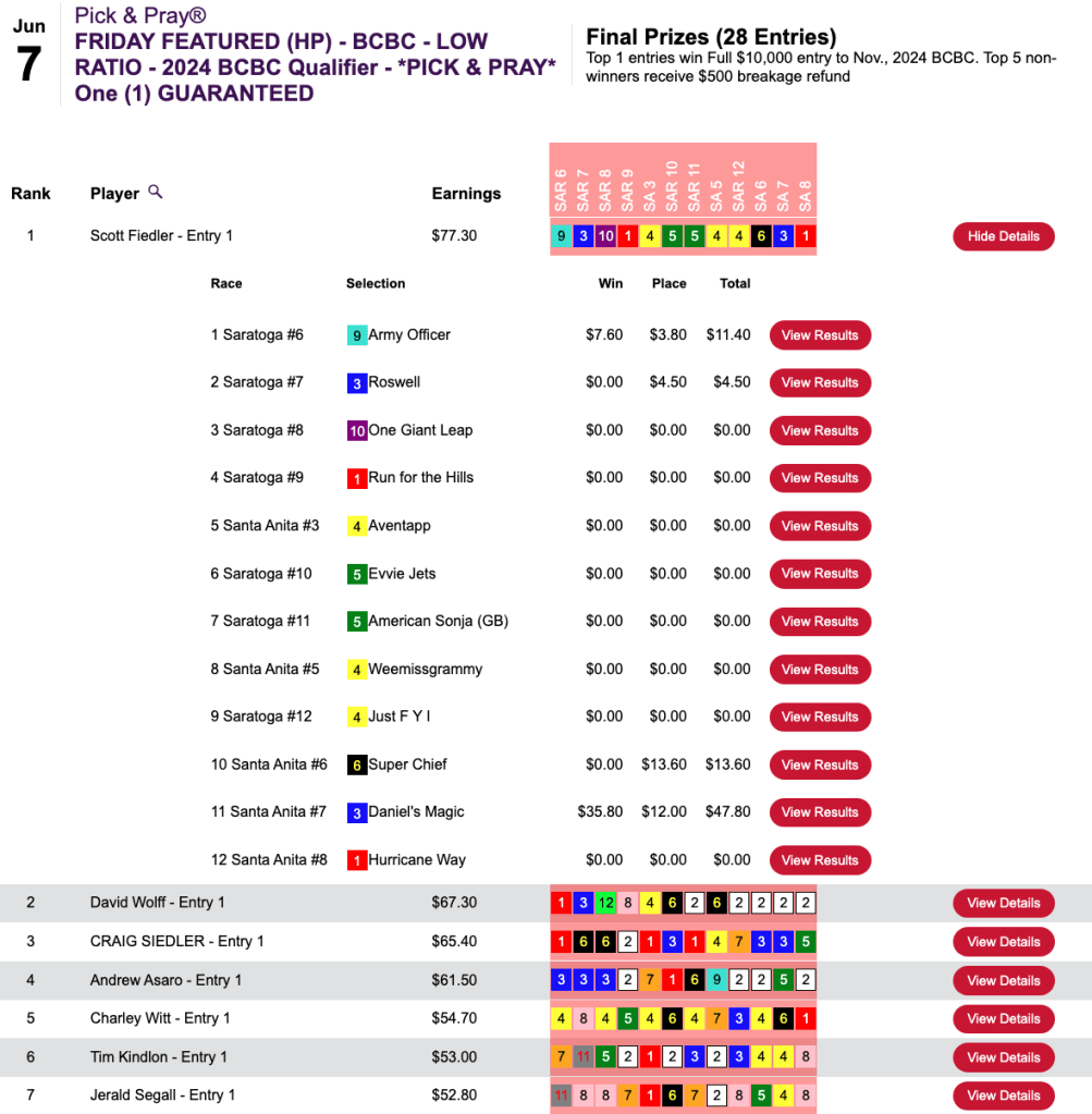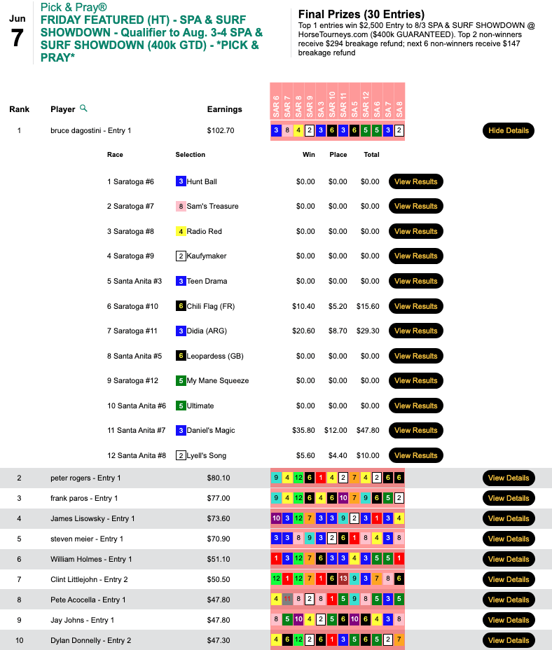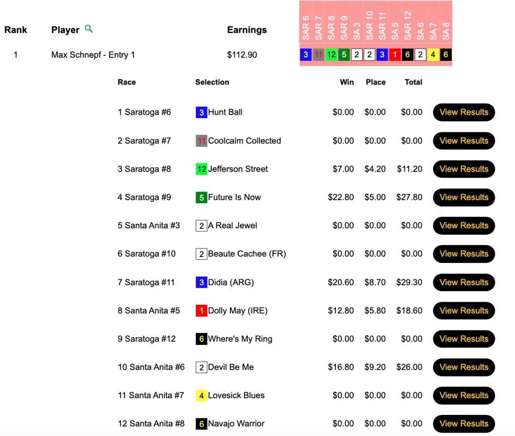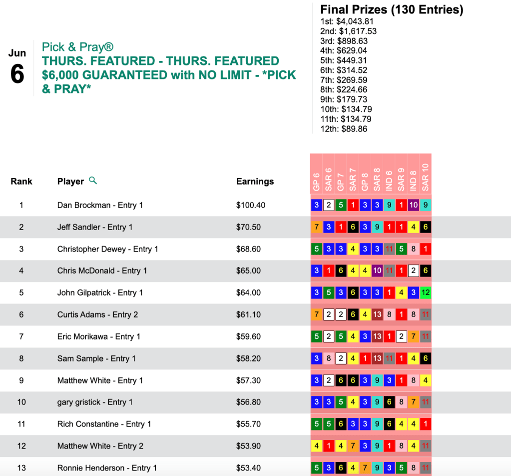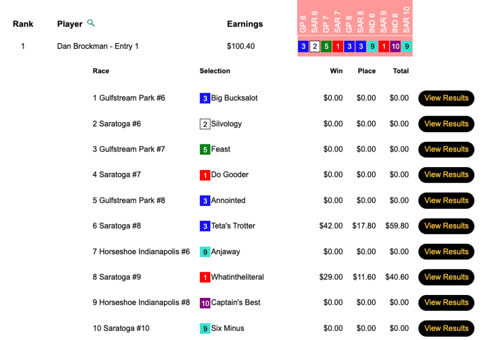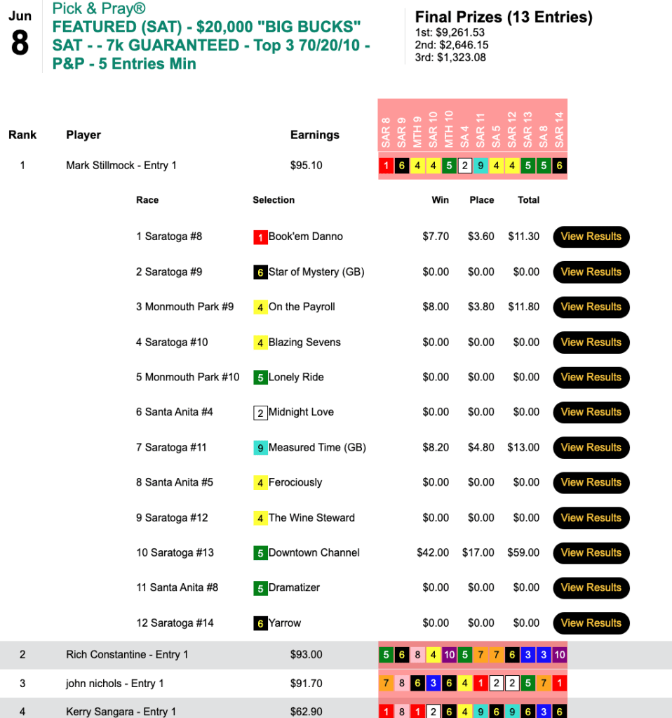Stillmock (4 winners that were all at Saratoga, 0 places) pocketed $9,261 for leading the way in Saturday’s $7,000 Gtd. Big Bucks Pick & Pray, which had a final prize pool of $13,230.