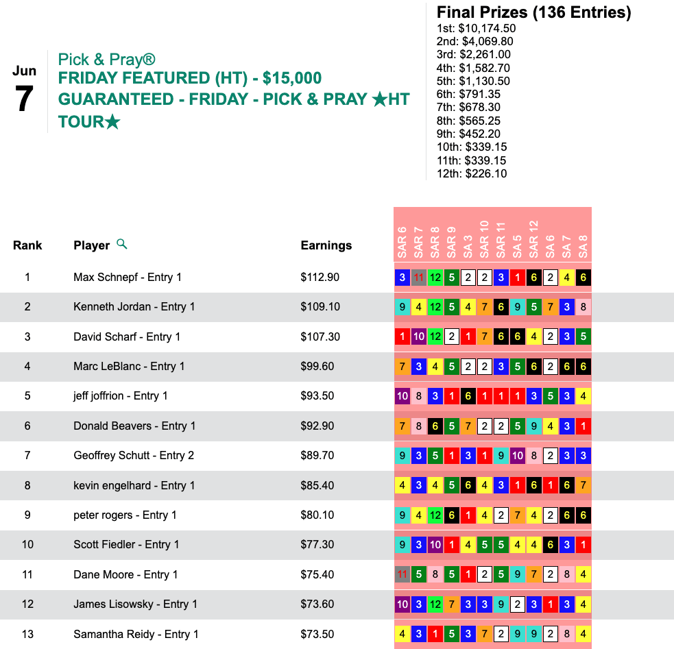 Settle cashed for $16,632 in Saturday’s HT Tour battle, our $25,000 Gtd. Pick & Pray, which closed with a pot of $36,960.