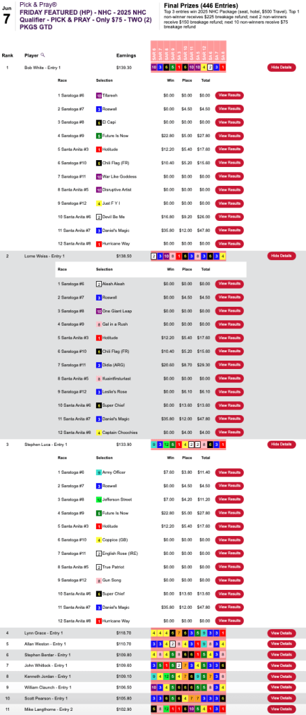 They were the three at the top of the leaderboard of the other Friday feature at HorsePlayers, the three-seat, $75 NHC qualifier.
