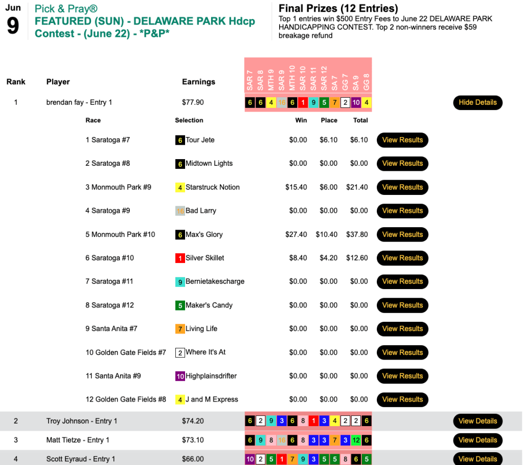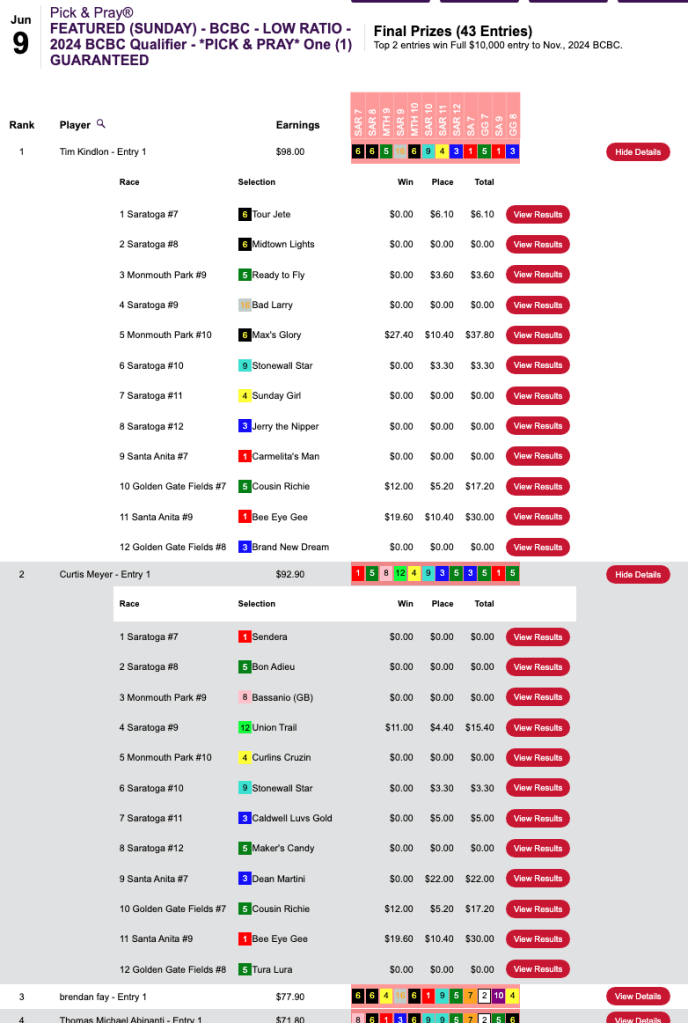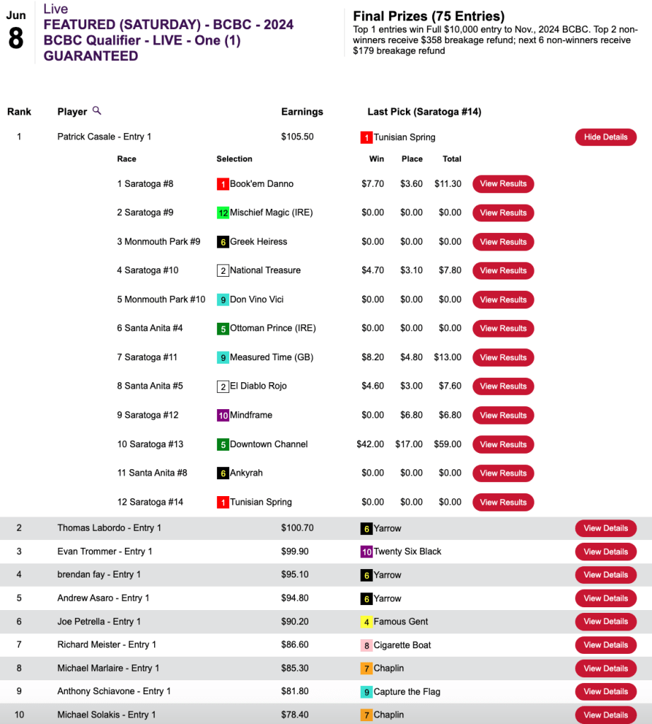 Thanks to everyone for spending part of your Belmont Stakes week with us. The 2024 Triple Crown is now in the books, but the summer racing season is still ahead of us. We’ll do what we can to make it all just a little bit more exciting for you. More featured tourneys coming up on Wednesday—and more recaps on Monday, of course.