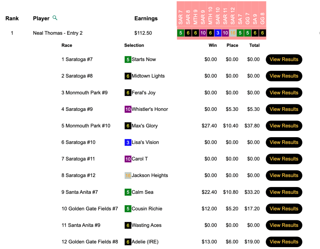 Wiener (3 wins, 2 places) and fellow $2,500 seat winner Ilan Cuellar (2W, 4P) both nailed Max’s Glory ($27.40, $10.40) in the 10th at Monmouth. And like Neal Thomas, Cuellar won with Adelie in the Golden Gate swan song.