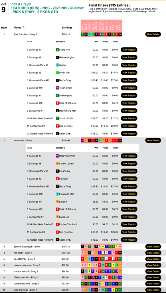 Raul Sanchez (6 wins, 0 places) and Robert Weir (5W, 2P) were the two package winners in Sunday’s $165 NHC qualifier here at HorseTourneys.