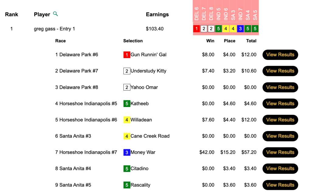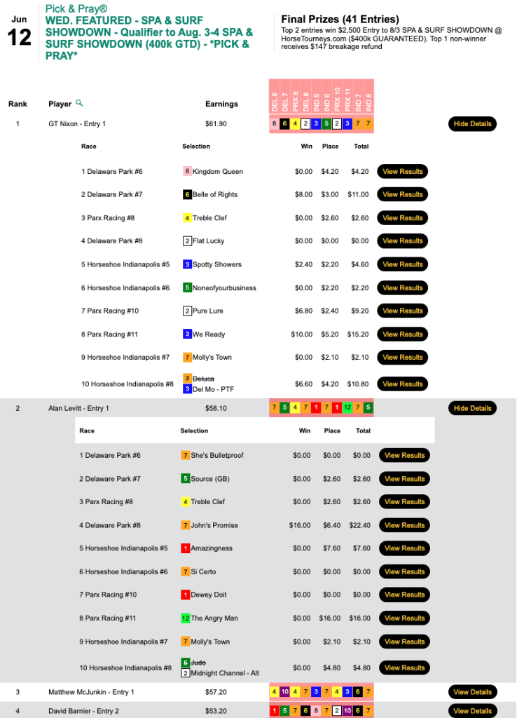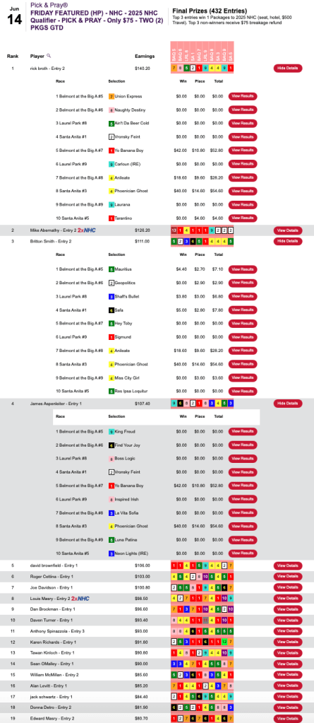 The other Friday feature at HorsePlayers, our always-popular $75 NHC qualifier, was captured by Rick “I-65” Broth (3 wins, 1 place).