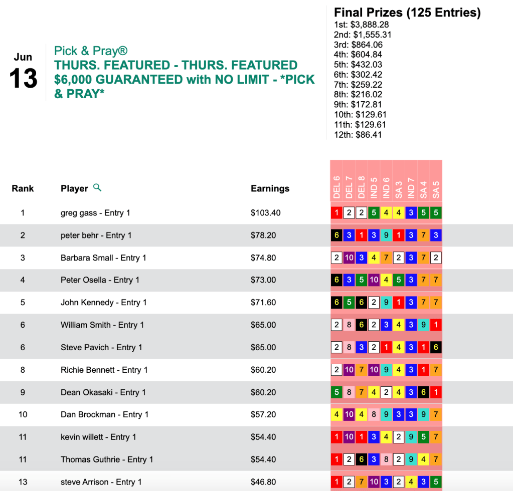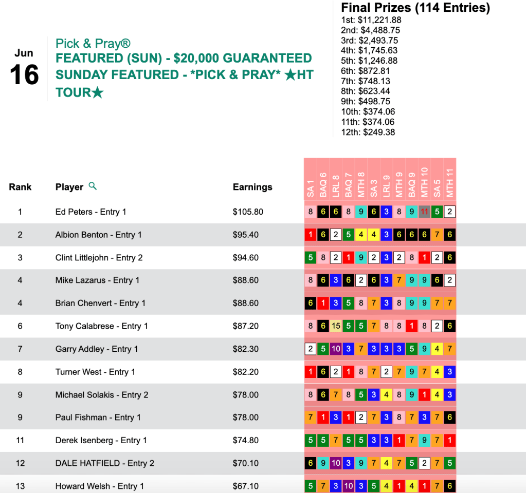 Peters pocketed $11,221 for taking Sunday’s $20,000 Gtd. Pick & Pray, which was ultimately worth a total of $24,937.