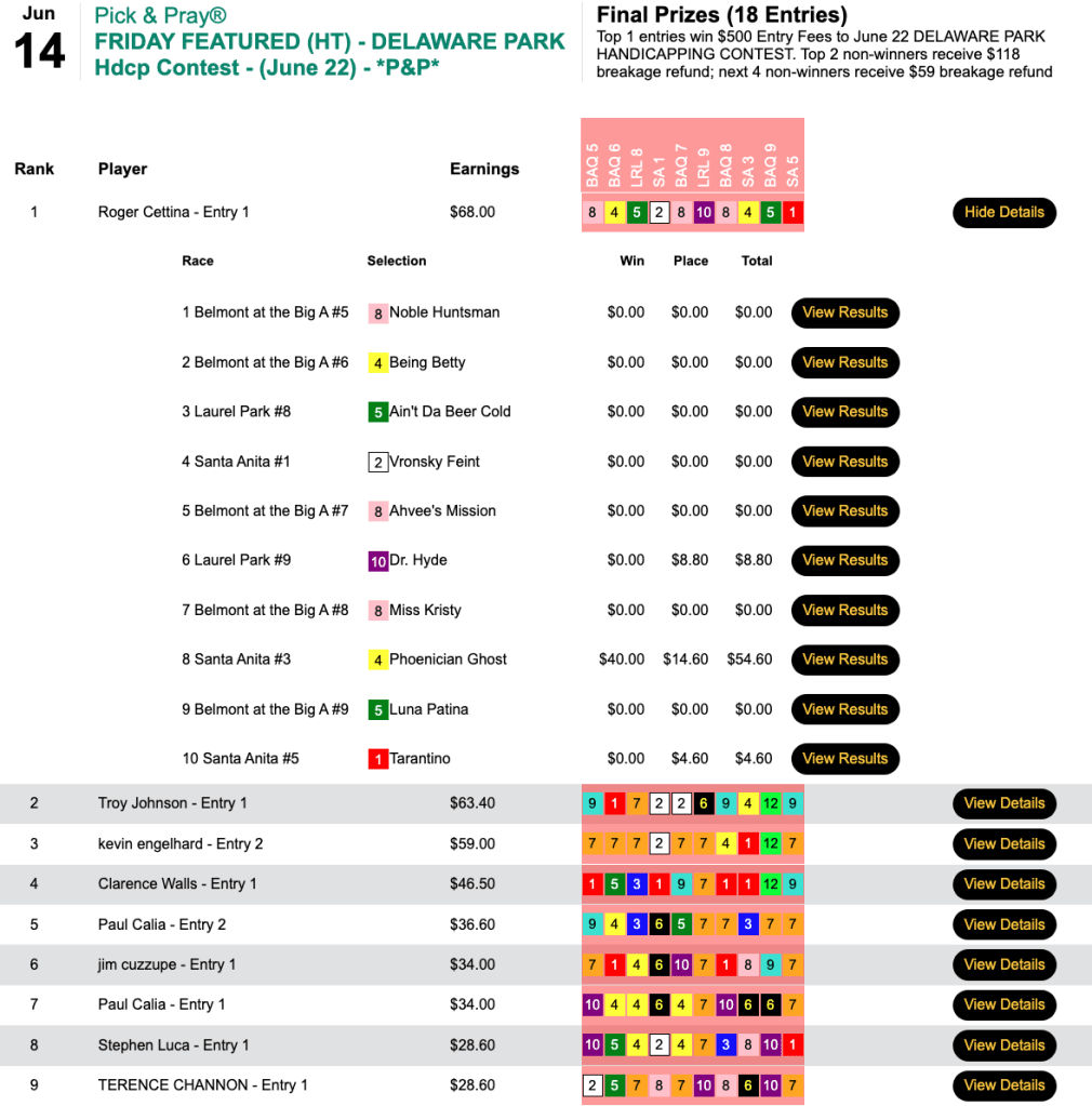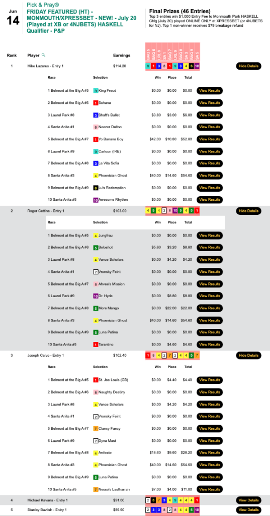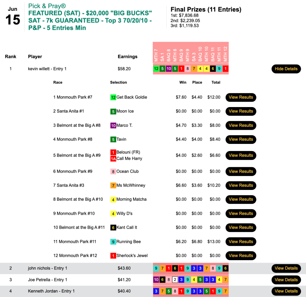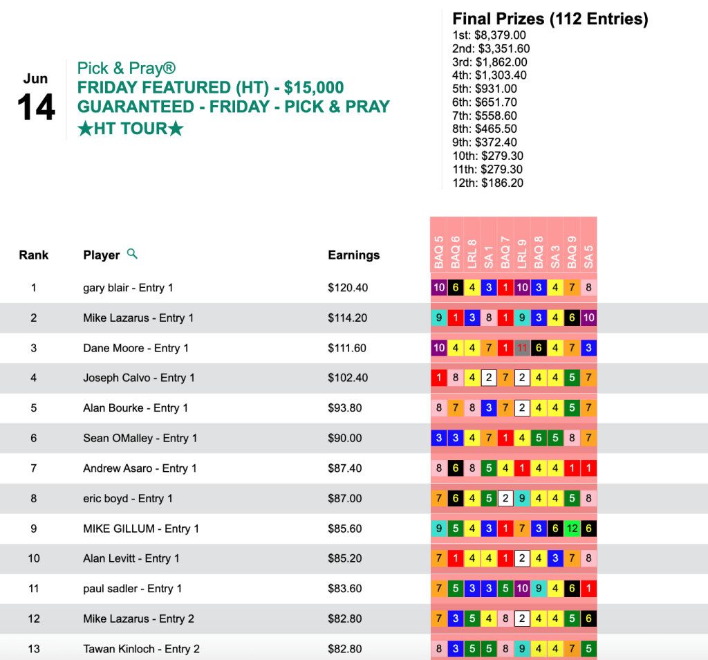 Blair (2 wins, 2 places) hit both Yo Banana Boy ($51.00, $10.80) in the 7th at BAQ and Phoenician Ghost ($40.00, $14.60) in race 3 at Santa Anita. The “twin killing” lined Blair’s pockets to the tune of $8,379 in Friday’s HT Tour competition, our $15,000 Gtd. Pick & Pray, which ultimately was worth a total of $18,620.