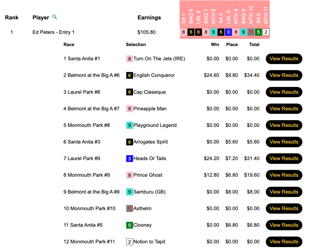 Fort Washington plus 3 place collections (two of them paying double digits) allowed Broberg to get his picture taken in the winner’s circle following this 26-entry competition at HorsePlayers. He’ll have to deal with a larger group of opponents in the NHC next March.