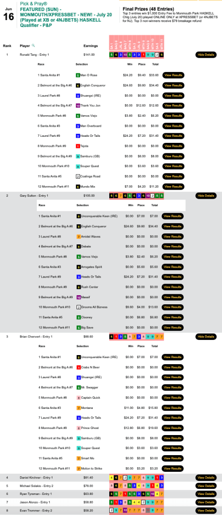 Tang led the way in Sunday’s play-in to the Haskell Handicapping Challenge, which saw Gary Sutton (4W, 2P) and Brian “BC” Chenvert also garner $1,000 entries for July 20.