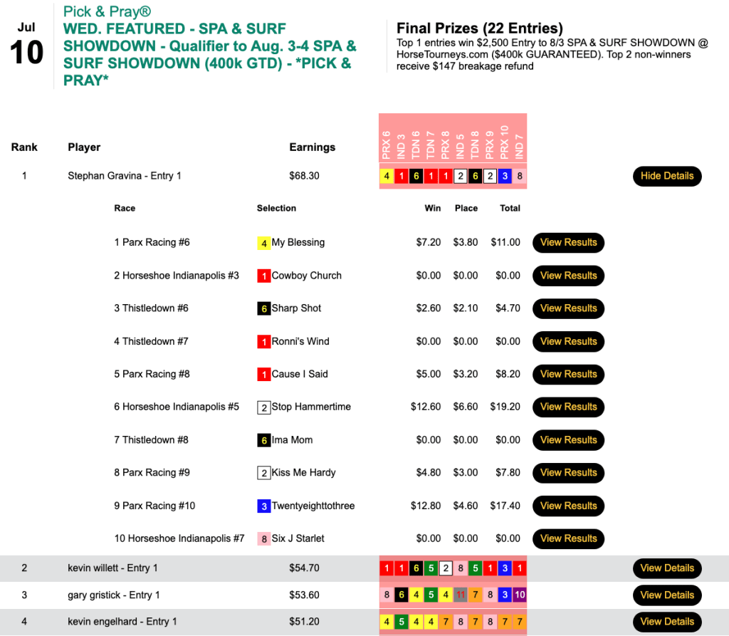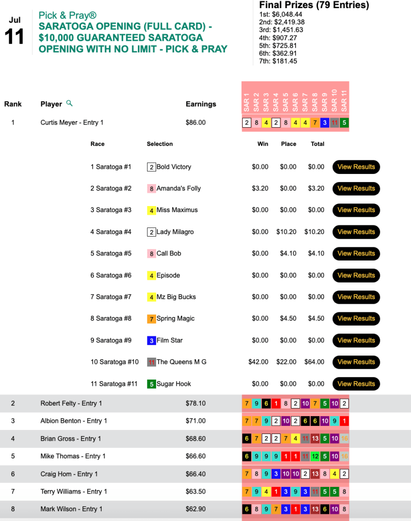 We also offered a special $10,000 Gtd. Pick & Pray on Thursday. It was focused solely on the meet-opening card at Saratoga.
