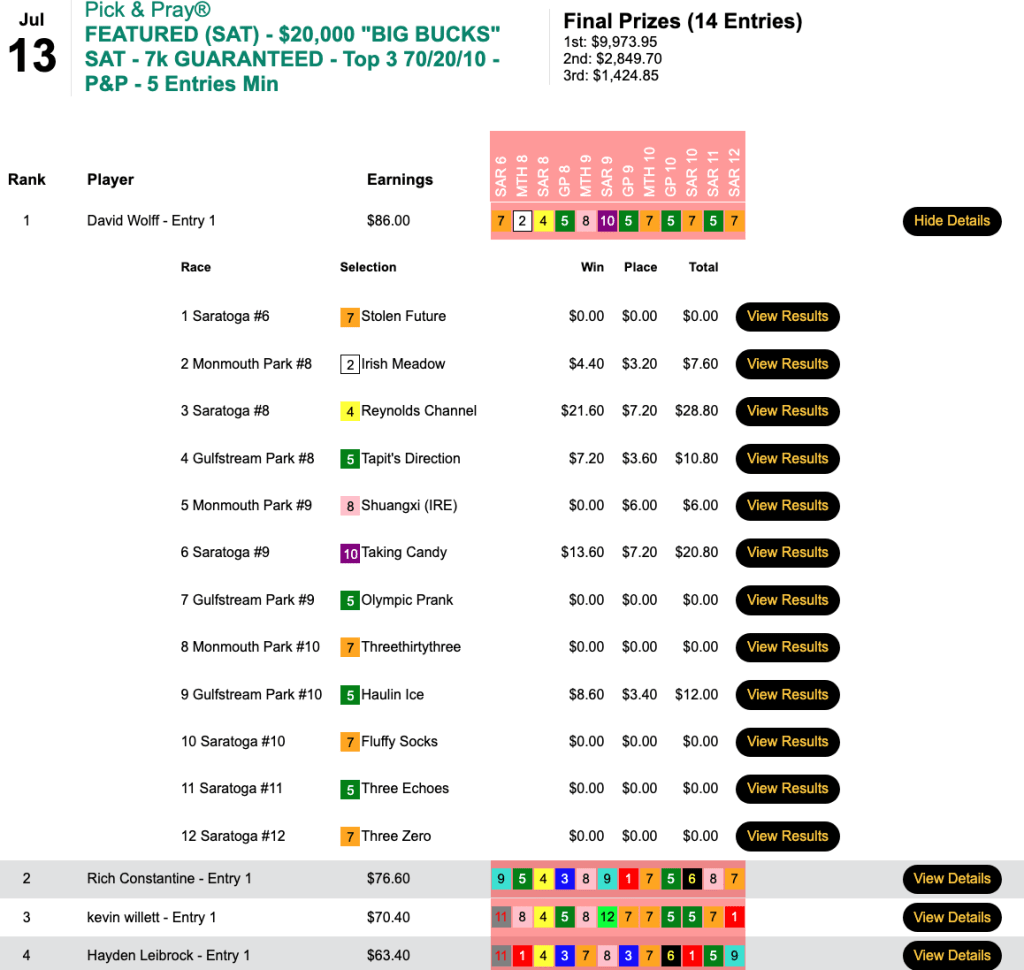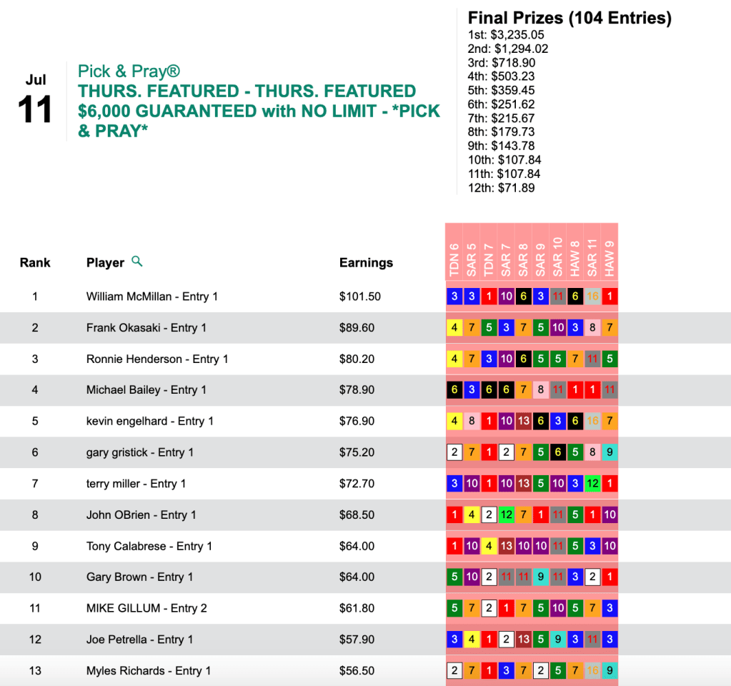 The only Pick & Pray on the Saturday slate was our $7,000 Gtd. Big Bucks tourney, which paid out a total of $14,248.