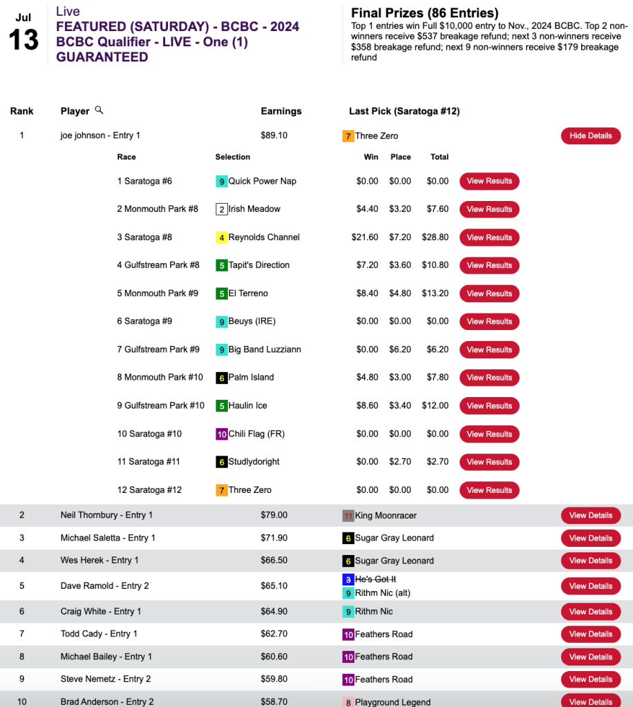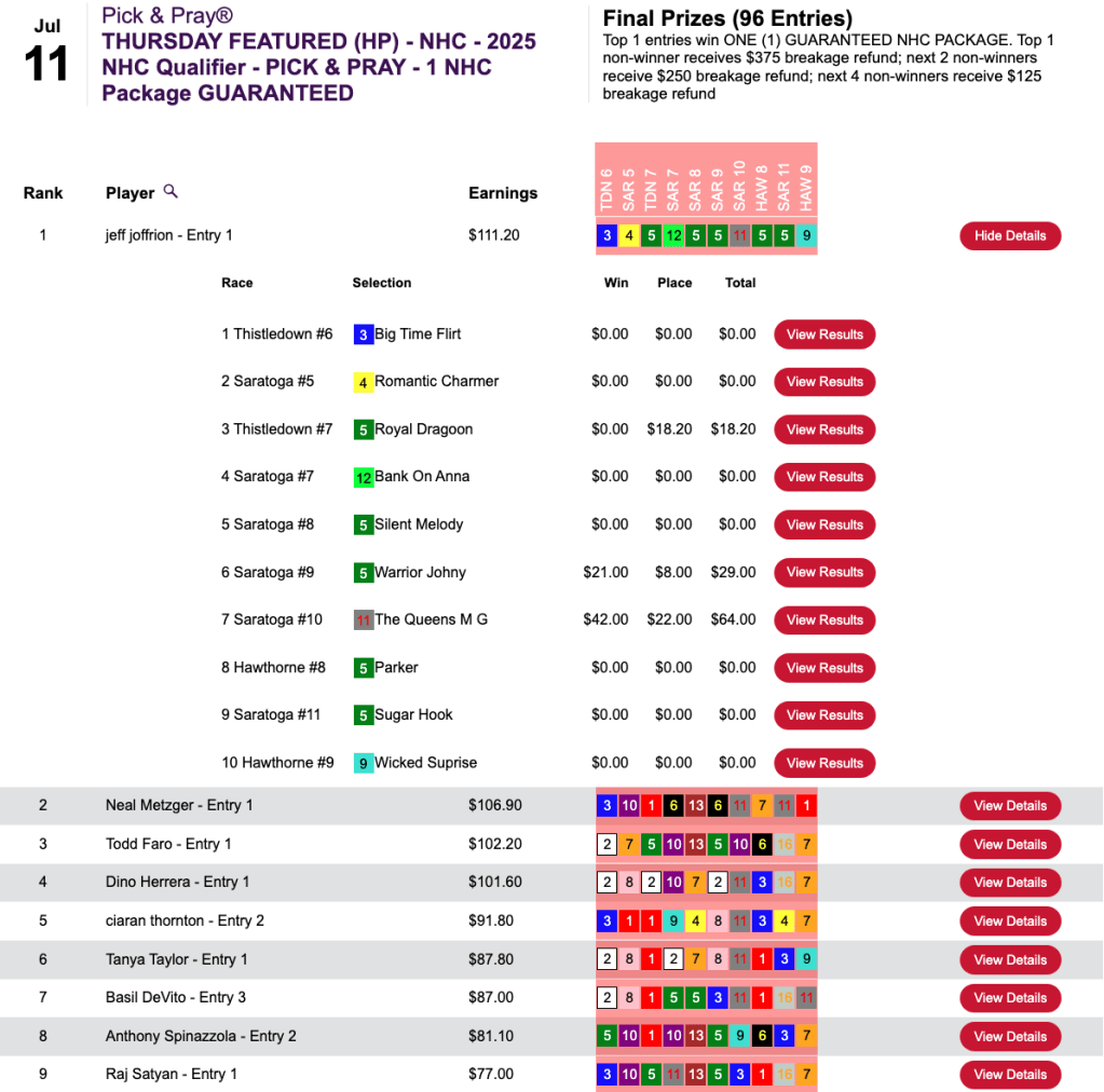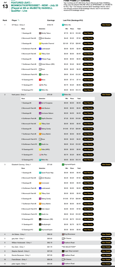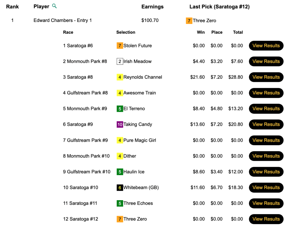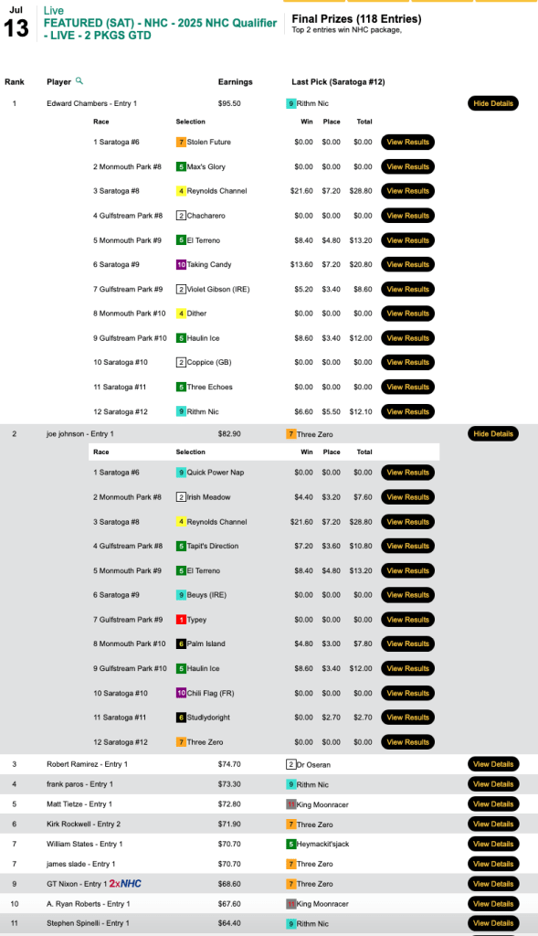 What was somewhat unusual in this game was that the final race, race 10 at Saratoga, had an inquiry/objection that resulted in the top two finishers being flip-flopped. That was good news for Morris because his pick of 5-1 Write Off Jerry got elevated to first. It was even better news for Morris—and Arrison—that first-place finisher Barnstorming got demoted to 2nd. Barnstorming was 25-1, and both 3rd-place finisher John Marino and 4th-place contestant Benjamin Posey had chosen Barnstorming. Had the original results been allowed to stand, Marino and Posey would have gotten the NHC seats. Instead, they had to settle for $165 breakage refunds.
