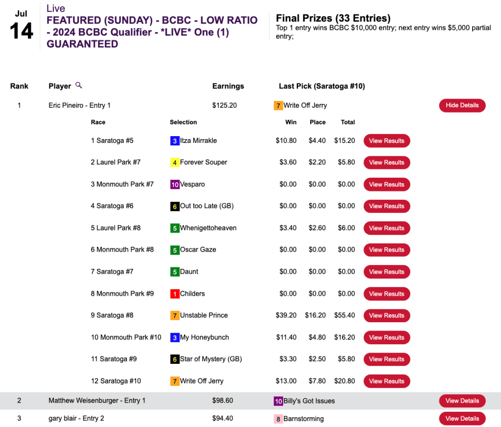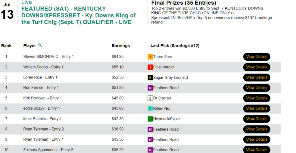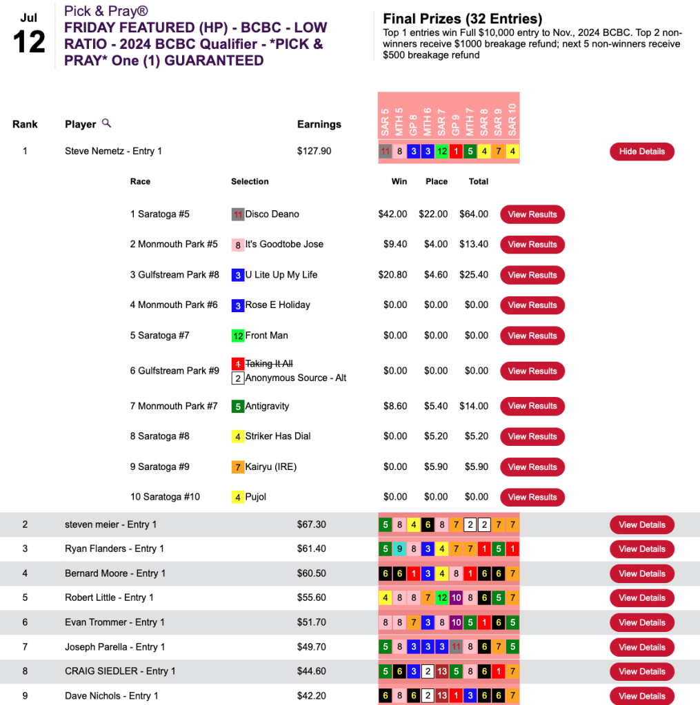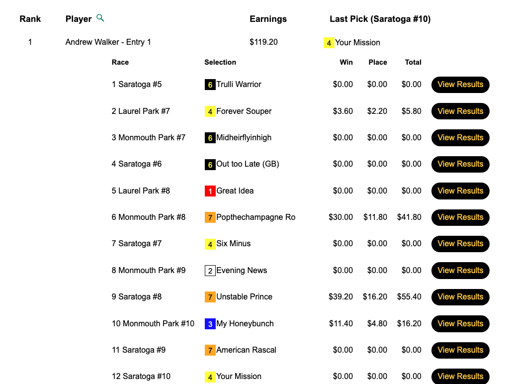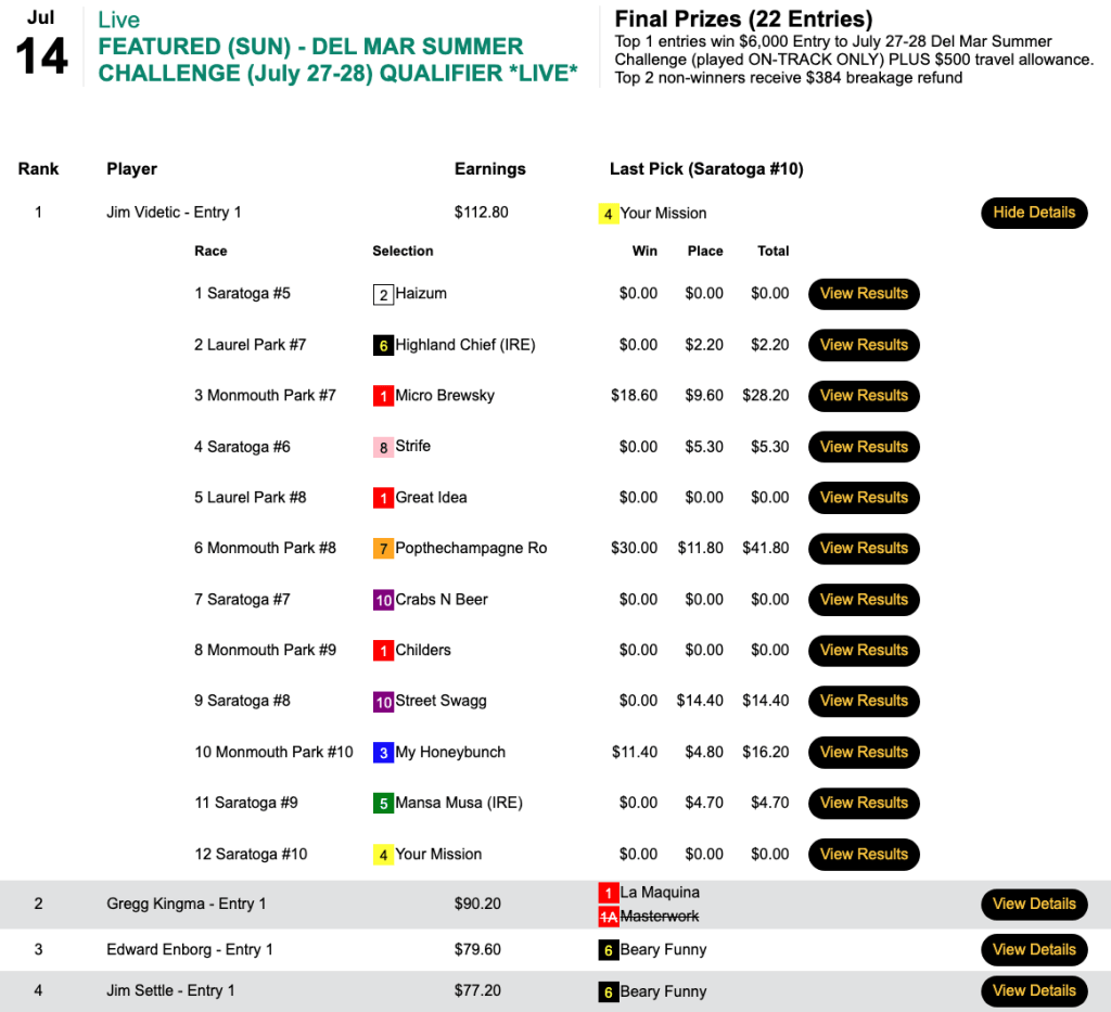 What was somewhat unusual in this game was that the final race, race 10 at Saratoga, had an inquiry/objection that resulted in the top two finishers being flip-flopped. That was good news for Morris because his pick of 5-1 Write Off Jerry got elevated to first. It was even better news for Morris—and Arrison—that first-place finisher Barnstorming got demoted to 2nd. Barnstorming was 25-1, and both 3rd-place finisher John Marino and 4th-place contestant Benjamin Posey had chosen Barnstorming. Had the original results been allowed to stand, Marino and Posey would have gotten the NHC seats. Instead, they had to settle for $165 breakage refunds.