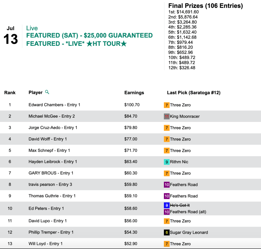 Chambers picked 6 winners, including Reynolds Channel ($21.60, $7.20) in the 8th at Saratoga, and he took home the grand prize of $14,691 in Saturday’s HT Tour game, our $25,000 Guaranteed competition. The final pot came to $32,648.